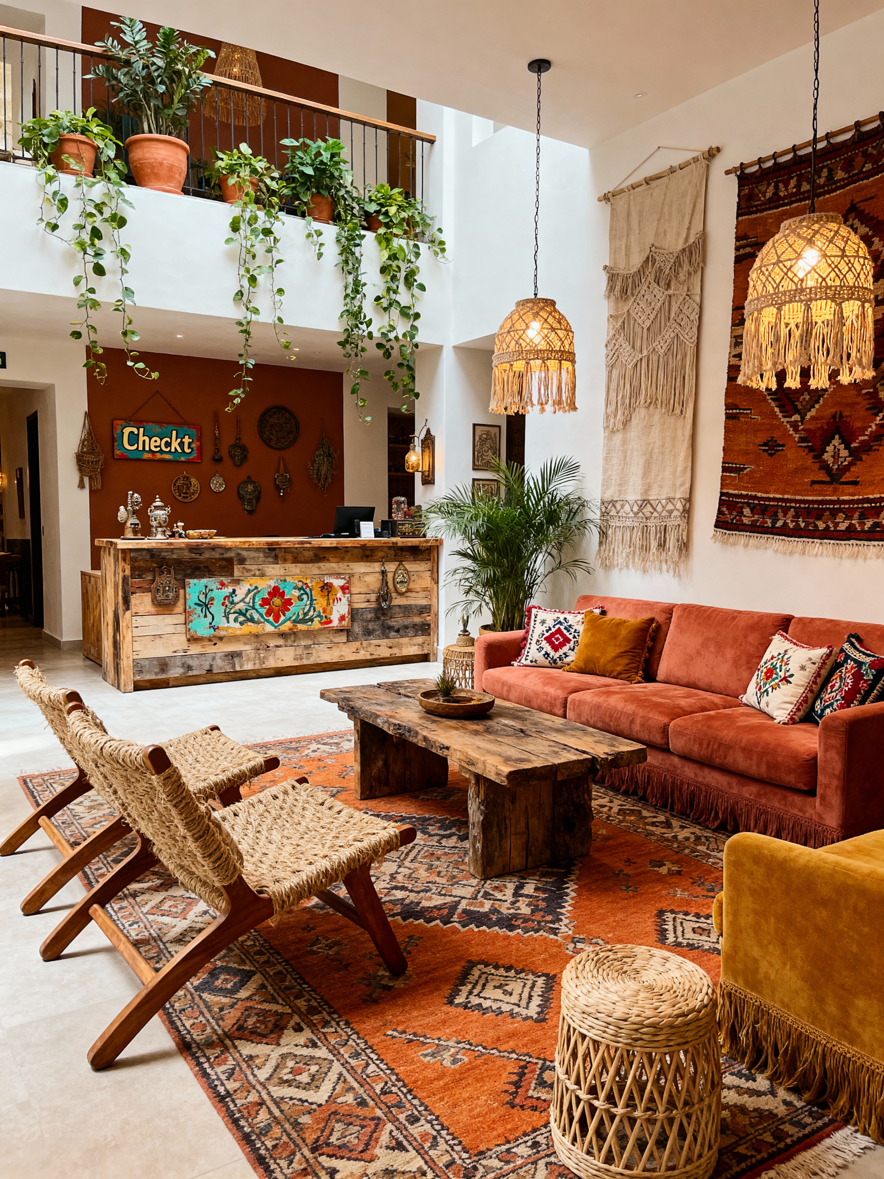 hotel lobby with boho-chic style with rug and sofas and hanging lamps and lounge chairs and furniture and coffee tables and plant and check in desk. . with vintage finds and bohemian flair and natural materials and artistic touches and earthy colors and layered textiles and relaxed atmosphere and eclectic mix