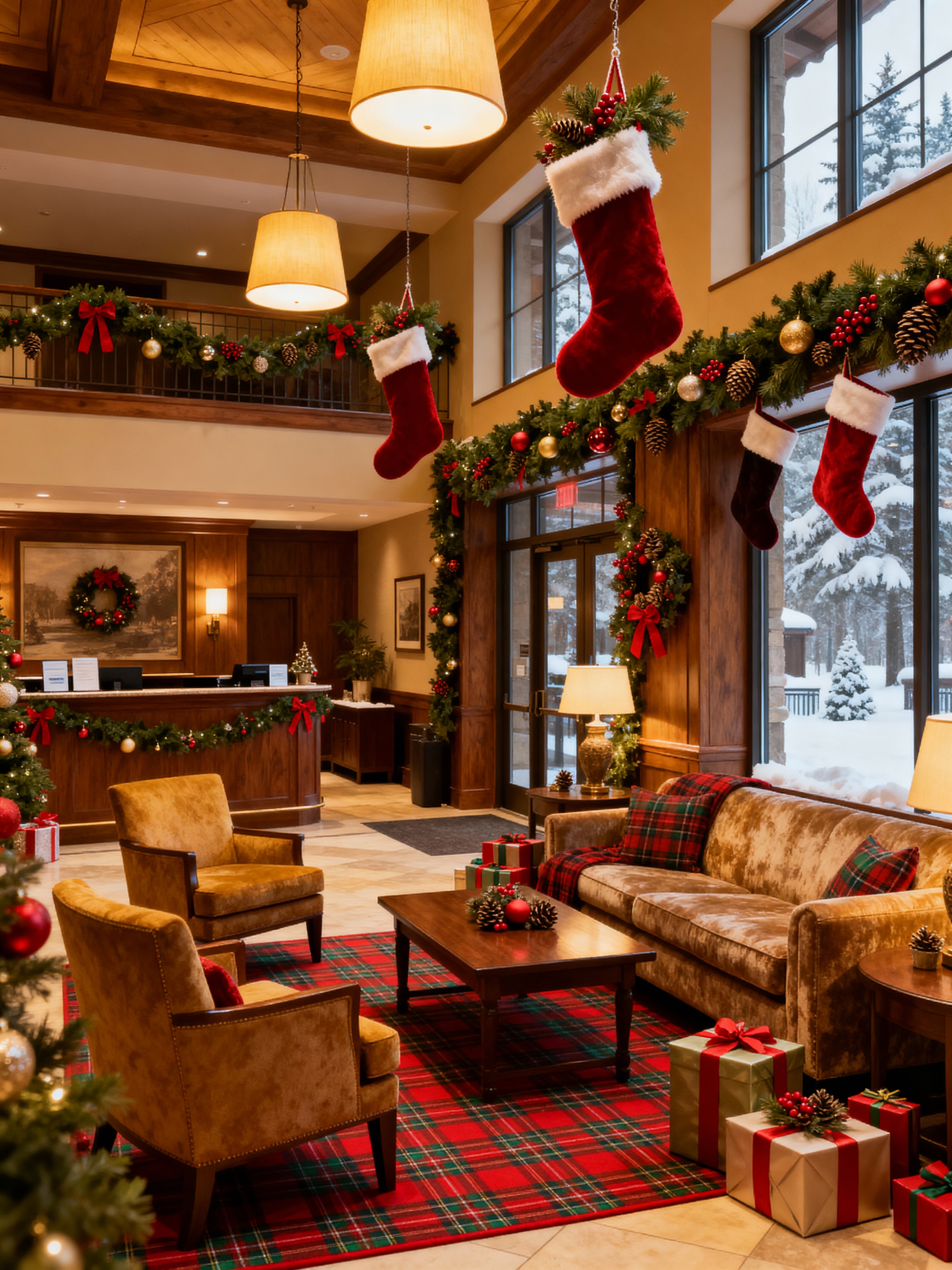hotel lobby with christmas style with lounge chairs and plant and rug and check in desk and sofas and furniture and hanging lamps and coffee tables. . with christmas ornaments and tie pinecones and berries and ribbons and berries and greenery draped and plaid rugs and snow outside and a few big socks hanging and giftwrapped gifts