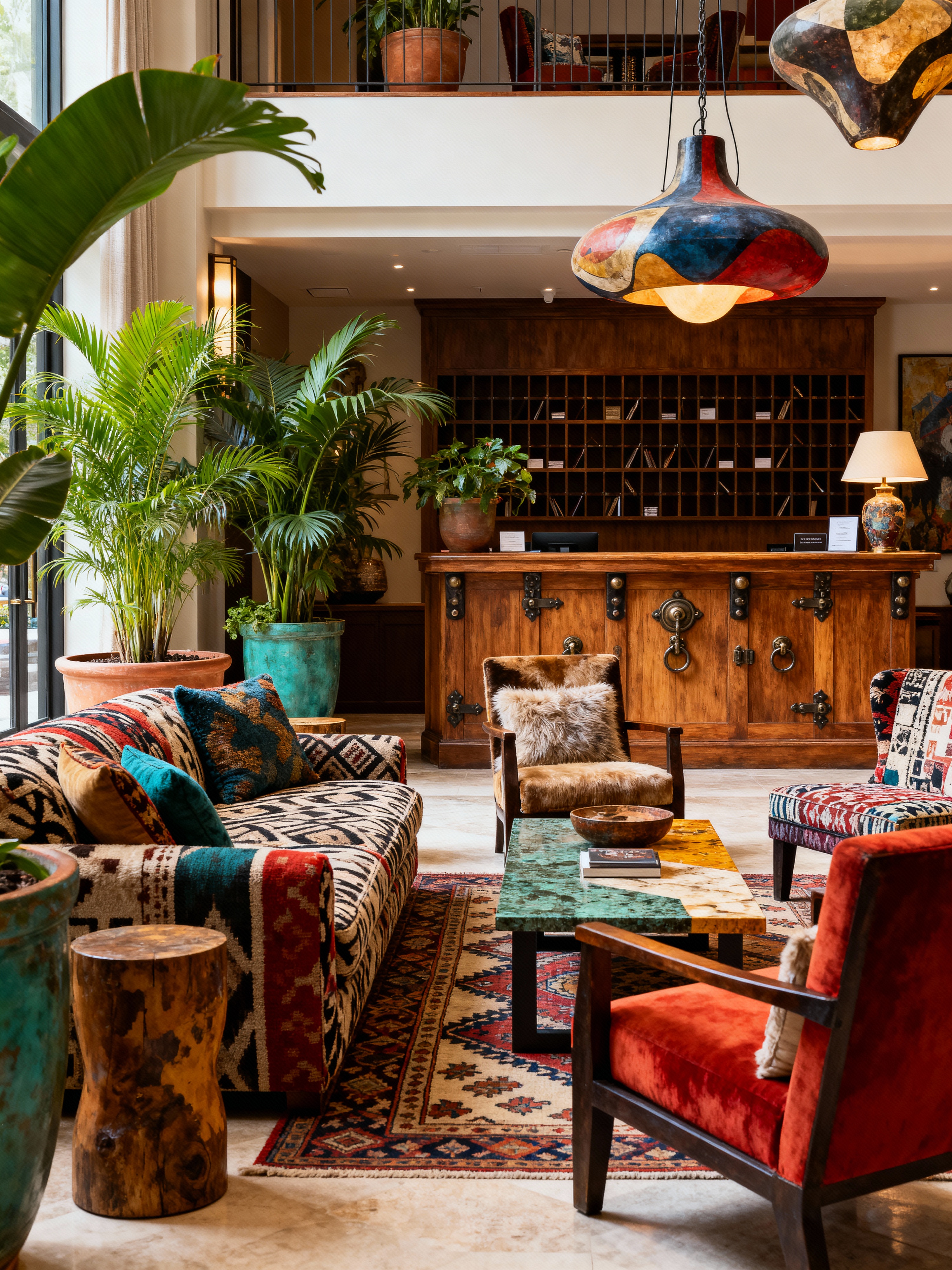 hotel lobby with eclectic style with plant and sofas and check in desk and furniture and lounge chairs and rug and coffee tables and hanging lamps. . with bold combinations and personal expression and unexpected elements and artistic flair and vintage finds and creative freedom and layered textures and unique pieces