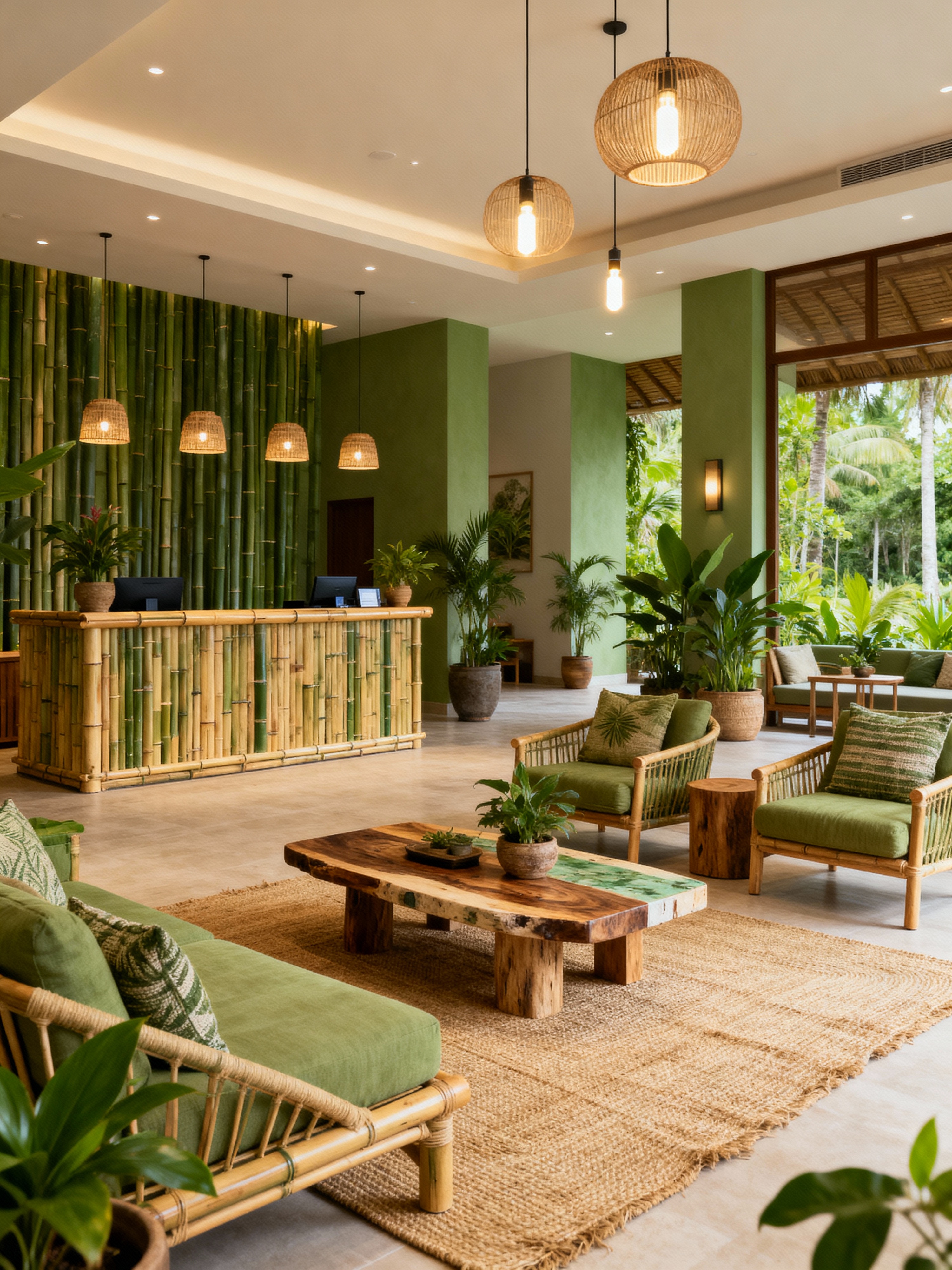 hotel lobby with eco-friendly style with sofas and hanging lamps and coffee tables and check in desk and lounge chairs and plant and rug and furniture. . with green living and renewable resources and recycled elements and bamboo furniture and non-toxic finishes and organic textiles and energy efficient and sustainable materials