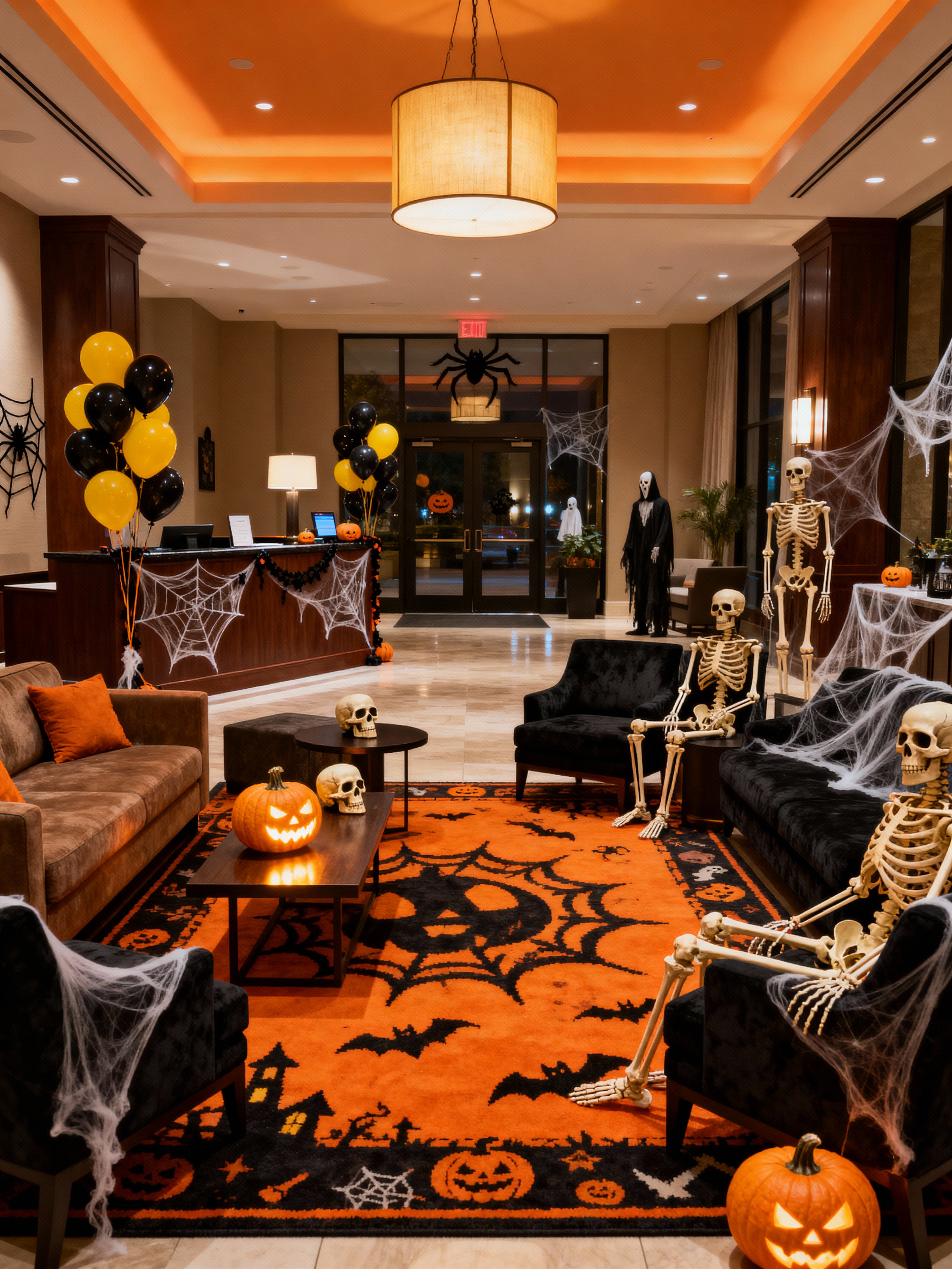 hotel lobby with halloween style with rug and sofas and hanging lamps and plant and lounge chairs and coffee tables and furniture and check in desk. . with lanterns and spiderwebs and yellow black balloons and lanterns and skeletons sitting and standing and glowing pumpkins and cobwebs and human skulls
