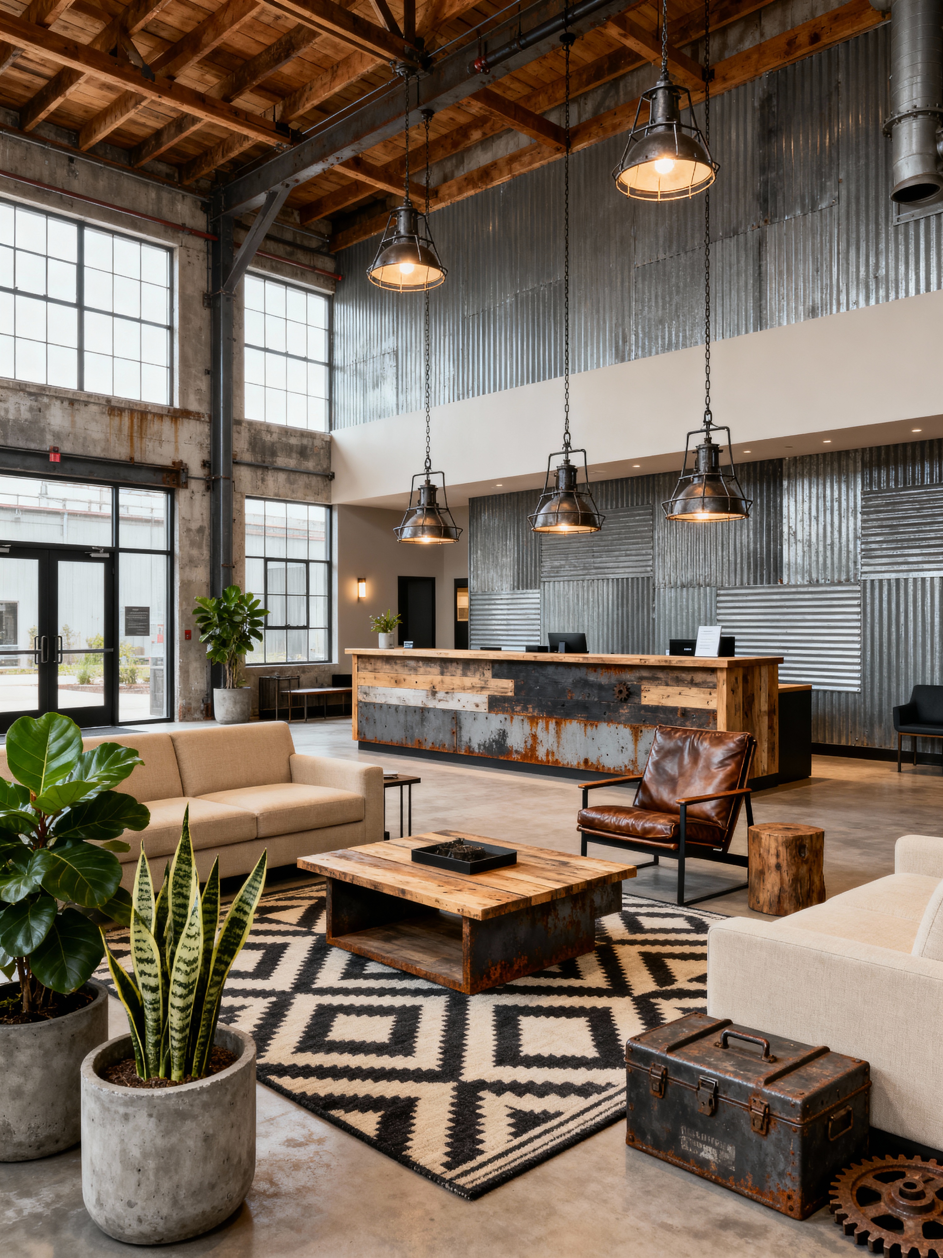 hotel lobby with industrial style with hanging lamps and rug and lounge chairs and plant and sofas and furniture and check in desk and coffee tables. . with exposed rafters and utilitarian objects and raw aesthetic and reclaimed wood and neutral tones and open floorplan and metal panels and factory style