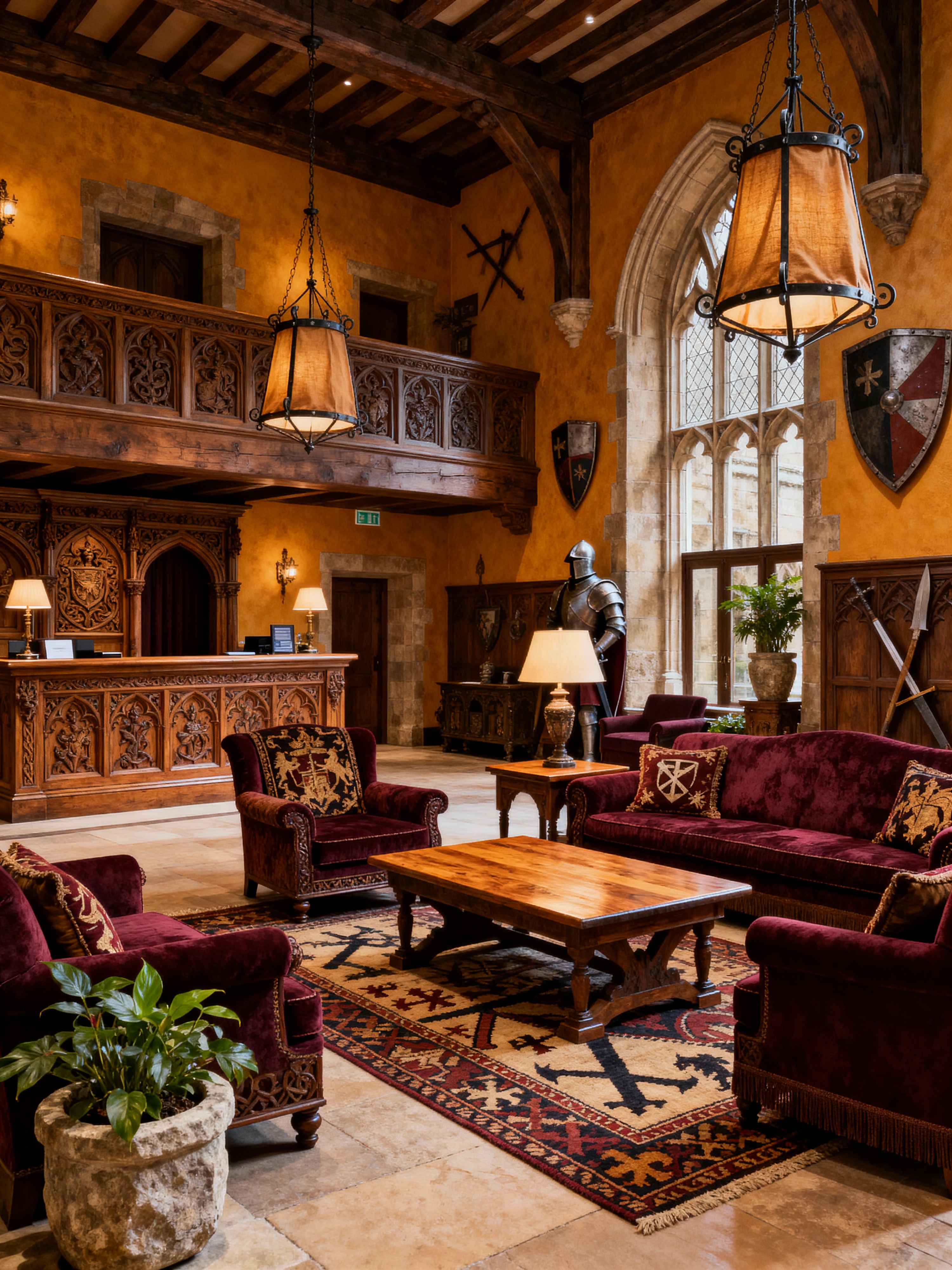 hotel lobby with medieval style with rug and coffee tables and hanging lamps and plant and sofas and check in desk and furniture and lounge chairs. . with upholstery on chairs and sofas and castle interior and castle interior and intricate wooden inlay designs and carvings and medieval shields on the wall and gothic appearance and heavy furniture pieces and carved wooden chairs