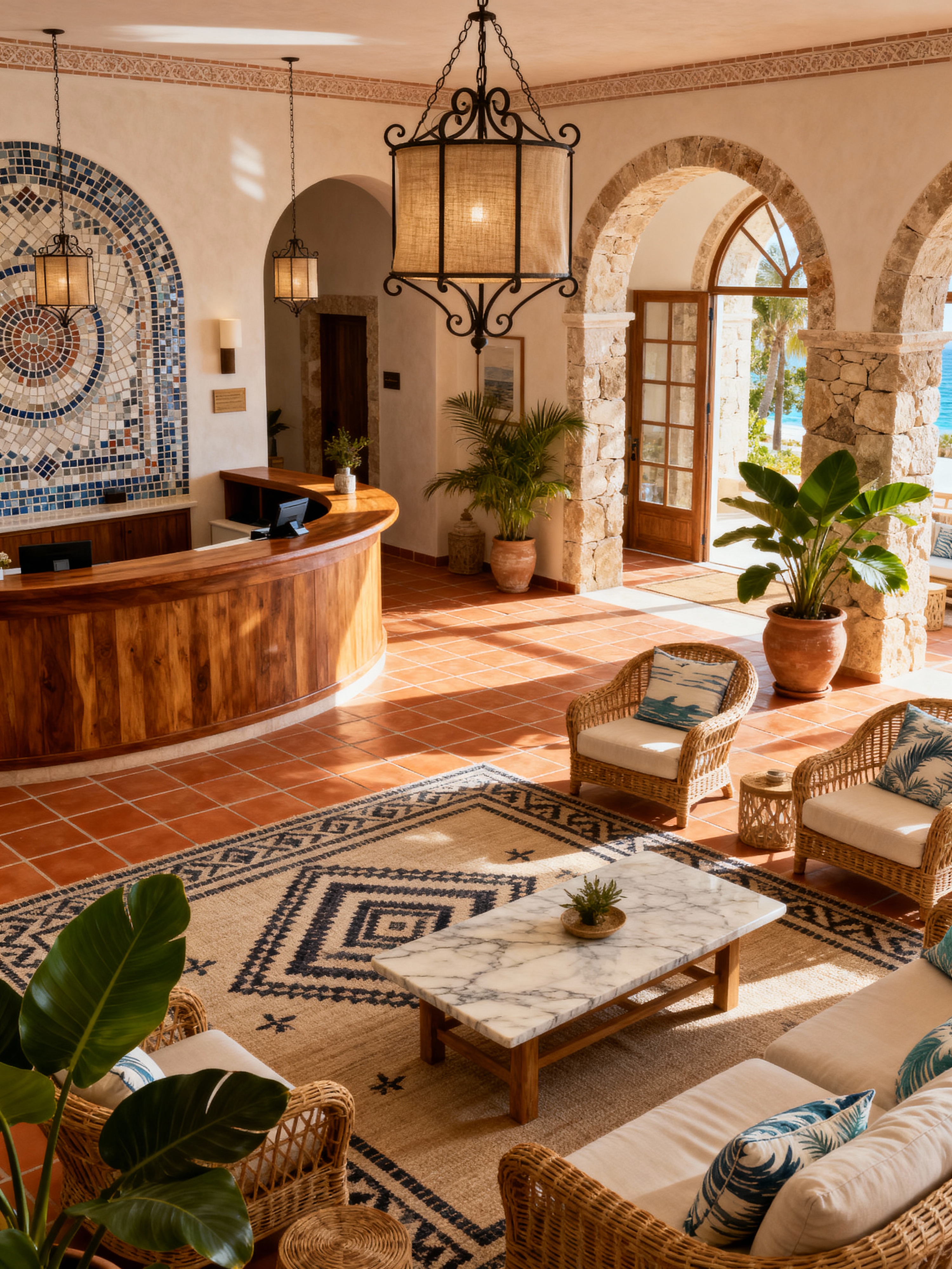 hotel lobby with mediterranean style with hanging lamps and check in desk and rug and coffee tables and lounge chairs and plant and sofas and furniture. . with rustic charm and terracotta tiles and mosaic patterns and stone accents and sun-drenched and coastal influence and warm earth tones and arched doorways