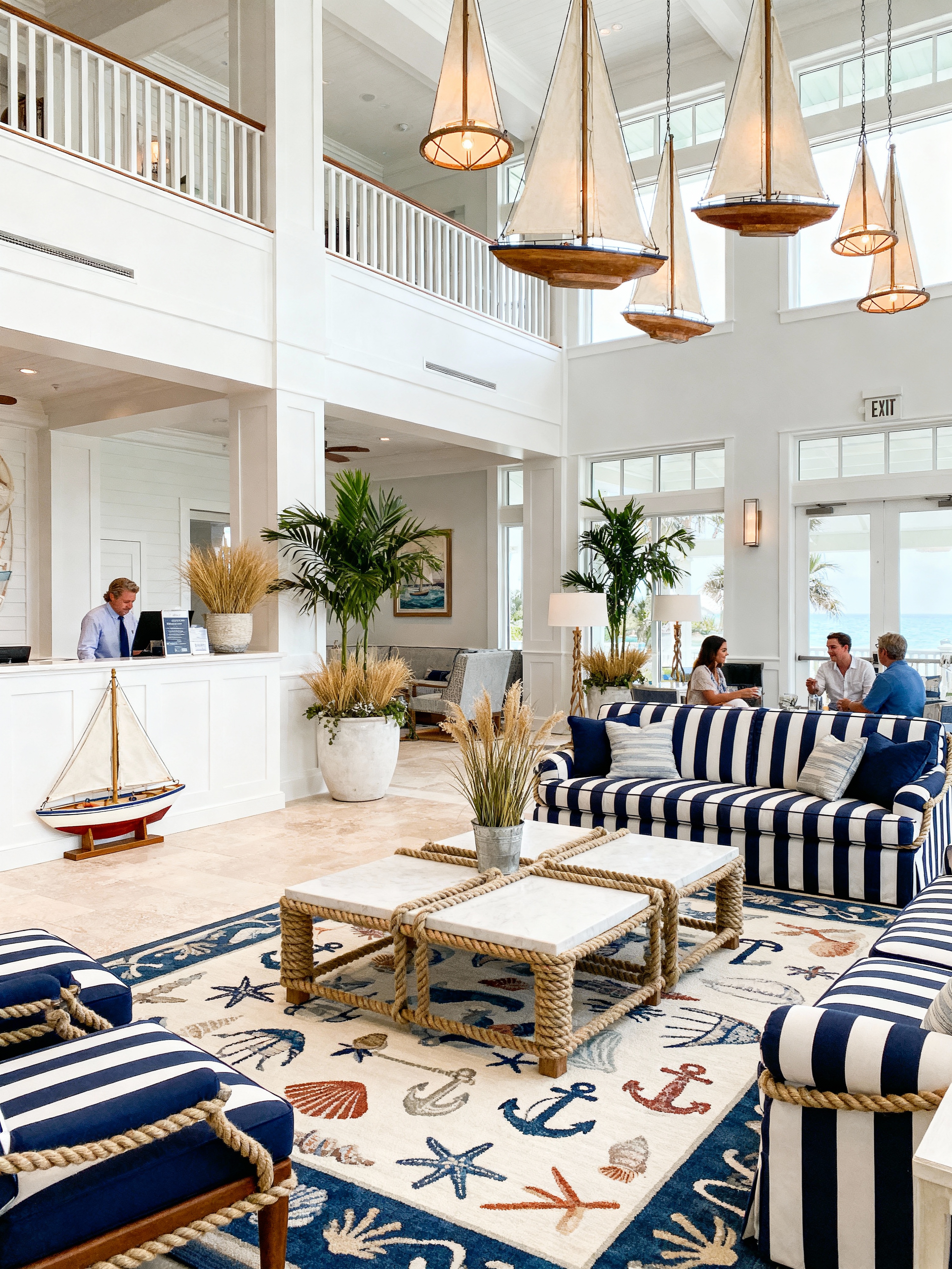 hotel lobby with nautical style with coffee tables and rug and hanging lamps and plant and sofas and check in desk and furniture and lounge chairs. . with coastal vibes and crisp white and sailboat elements and rope details and ocean inspiration and seaside charm and navy blue and maritime decor