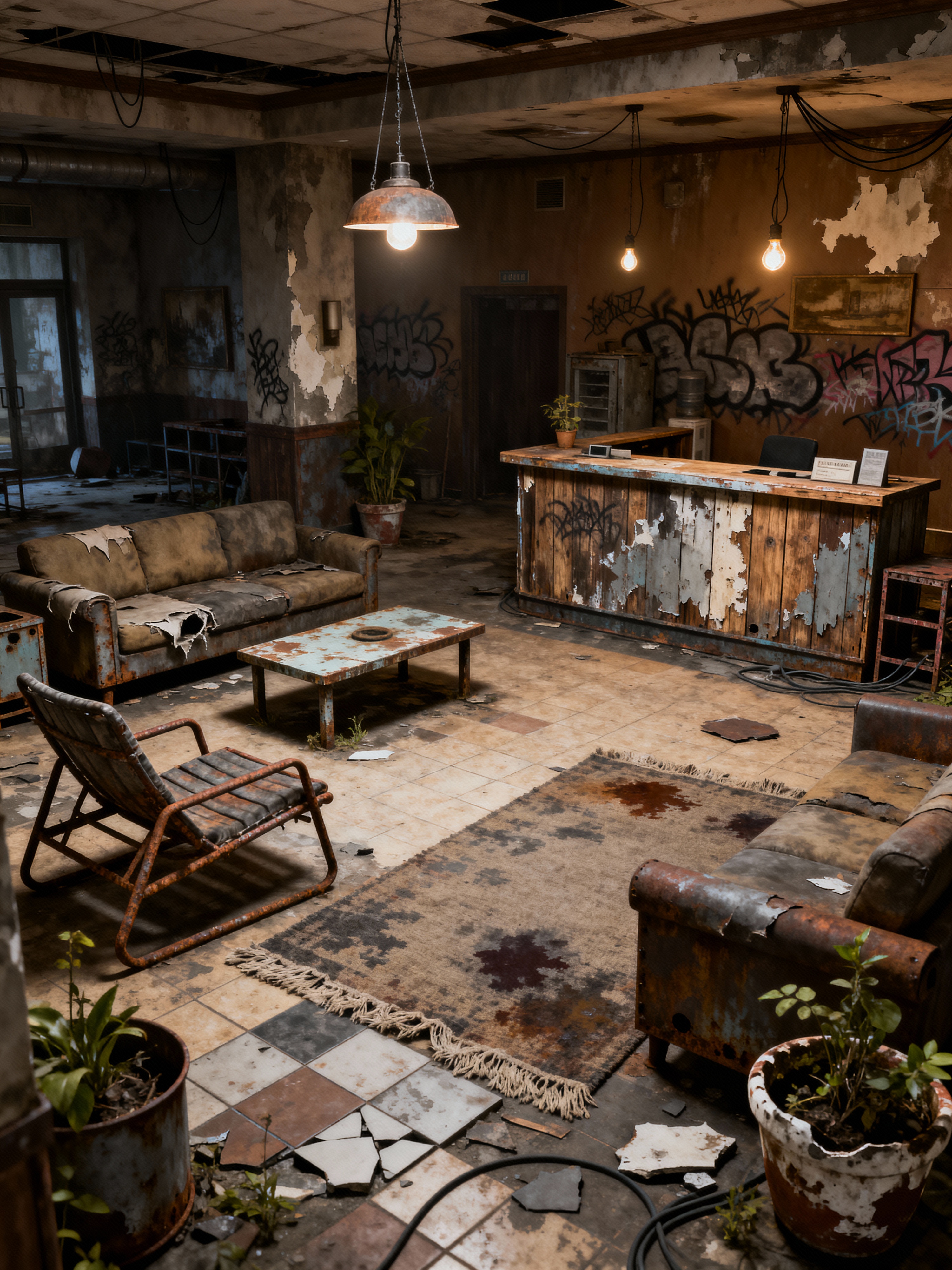 hotel lobby with post-apocalyptic style with sofas and lounge chairs and coffee tables and hanging lamps and check in desk and furniture and plant and rug. . with cheap mismatched furniture and neglected atmosphere and peeling paint and broken tiles and makeshift furniture and graffiti on walls and weathered materials and hanging exposed wires