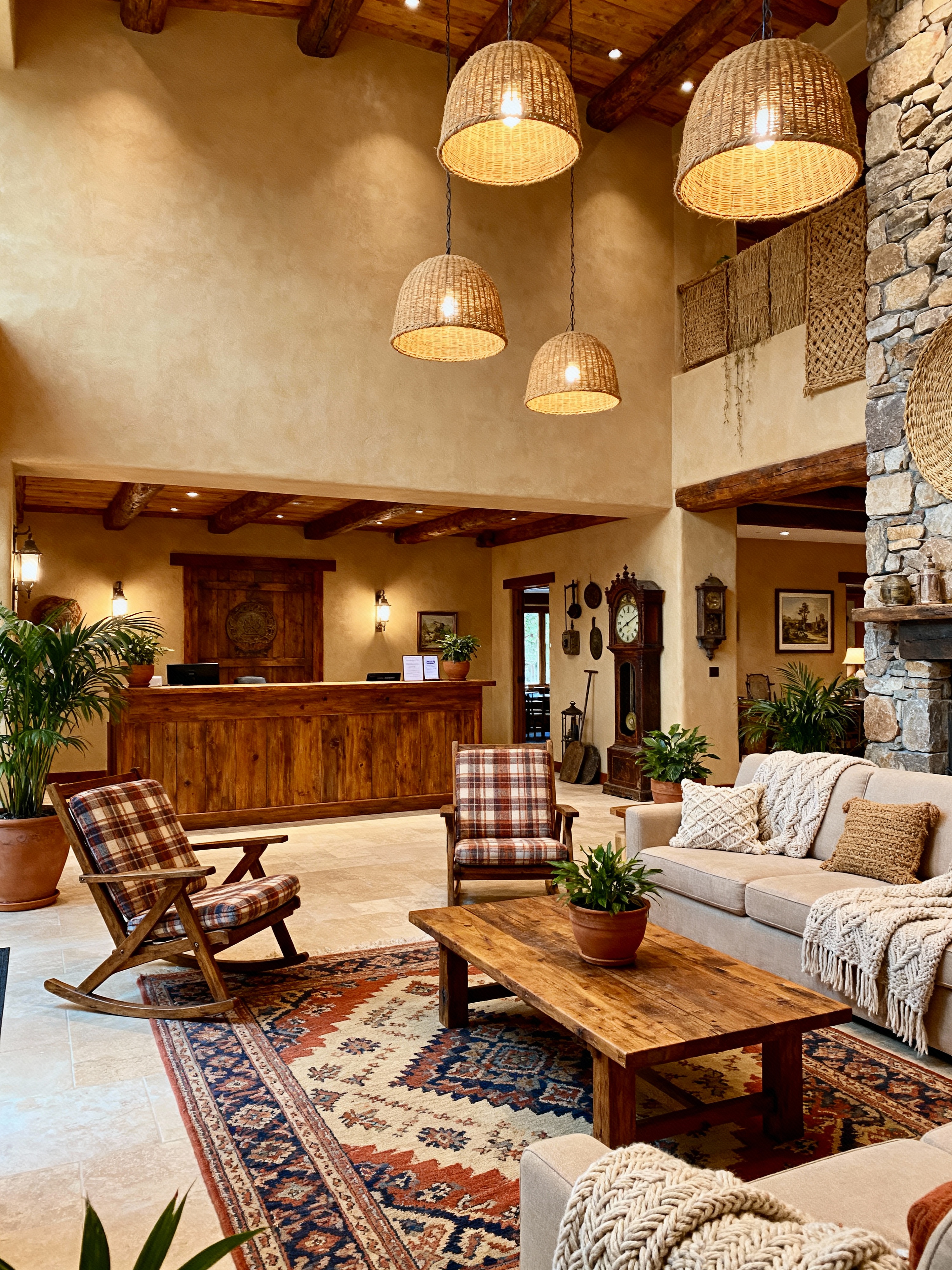 hotel lobby with rustic style with hanging lamps and furniture and check in desk and lounge chairs and rug and plant and sofas and coffee tables. . with cozy cabin and stone accents and woven textures and country style and warmth and earthy tones and vintage decor and exposed beams