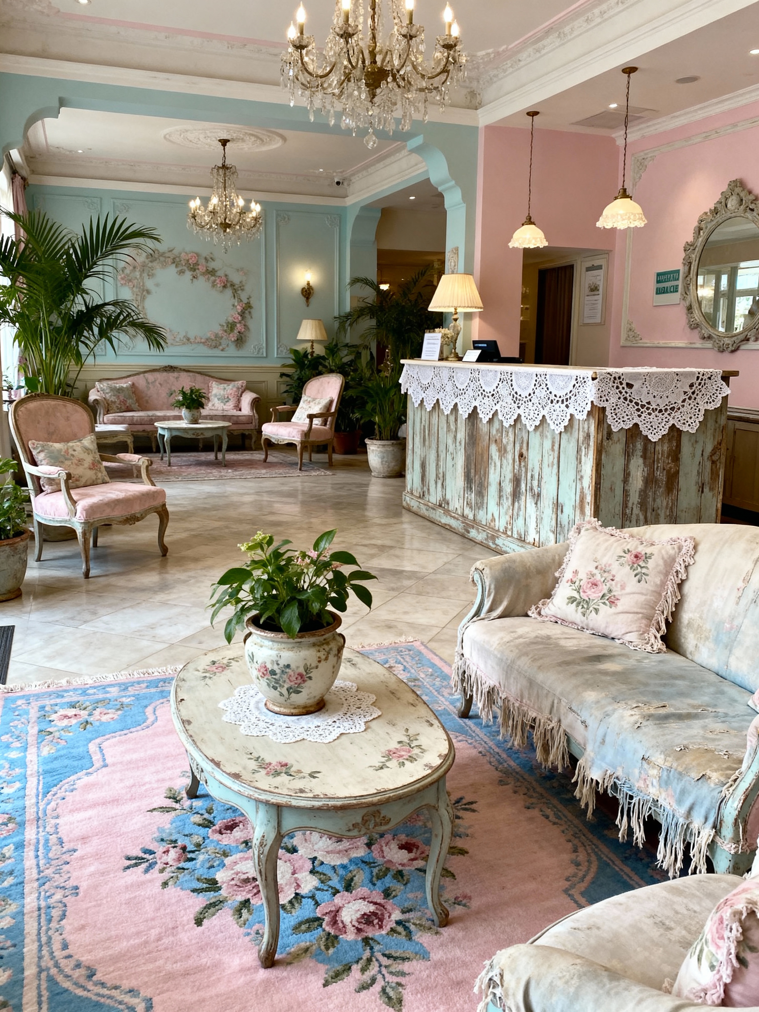 hotel lobby with shabby chic style with coffee tables and rug and furniture and plant and sofas and hanging lamps and lounge chairs and check in desk. . with delicate details and soft textures and vintage charm and romantic style and feminine touches and weathered finishes and pastel colors and antique lace
