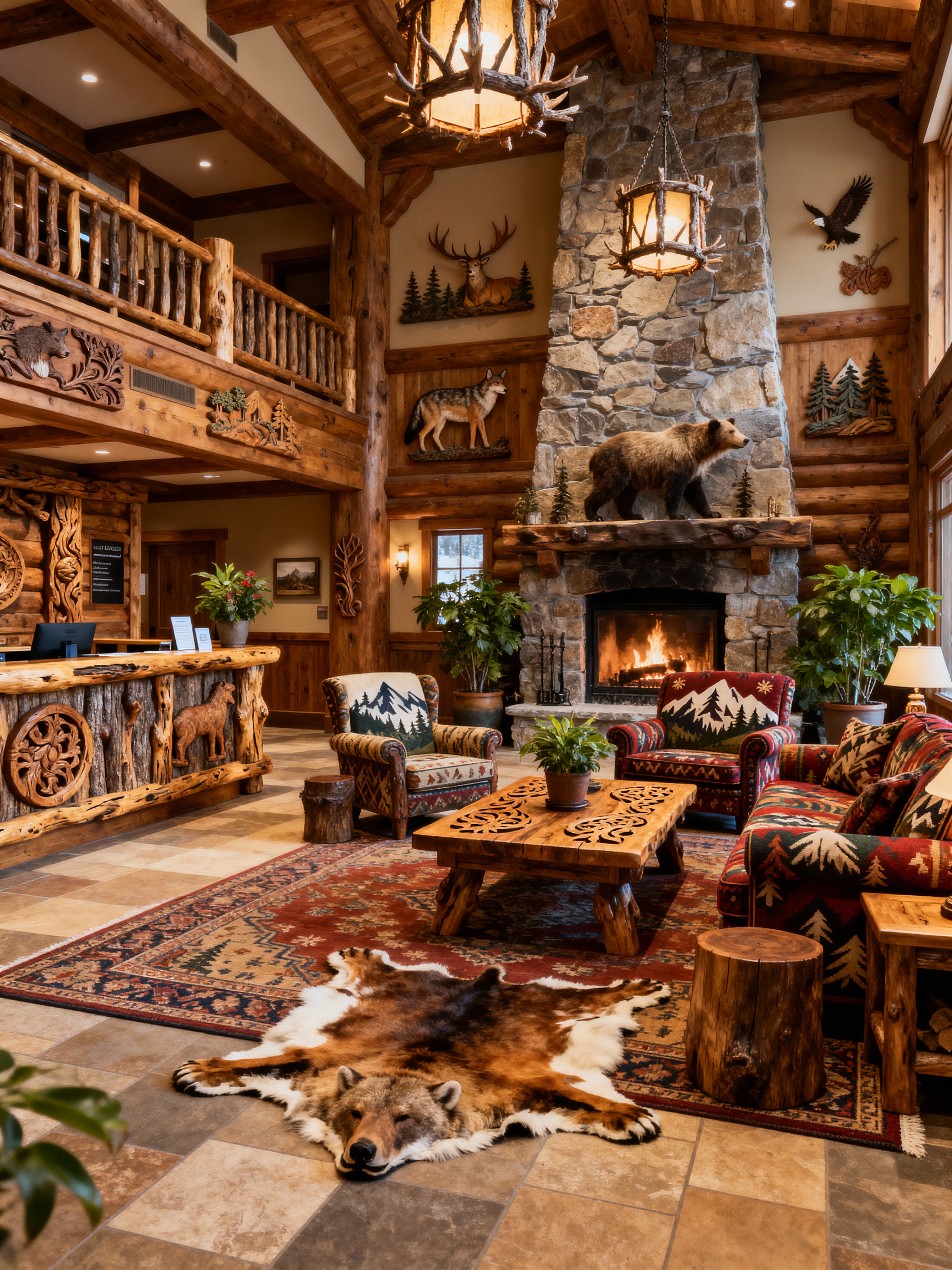 hotel lobby with ski chalet style with check in desk and lounge chairs and sofas and coffee tables and furniture and plant and rug and hanging lamps. . with stone fireplace and animal rugs and rustic and animal motifs and richly patterned fabrics and mountain-inspired and decorative carving and mouldings and nature-inspired