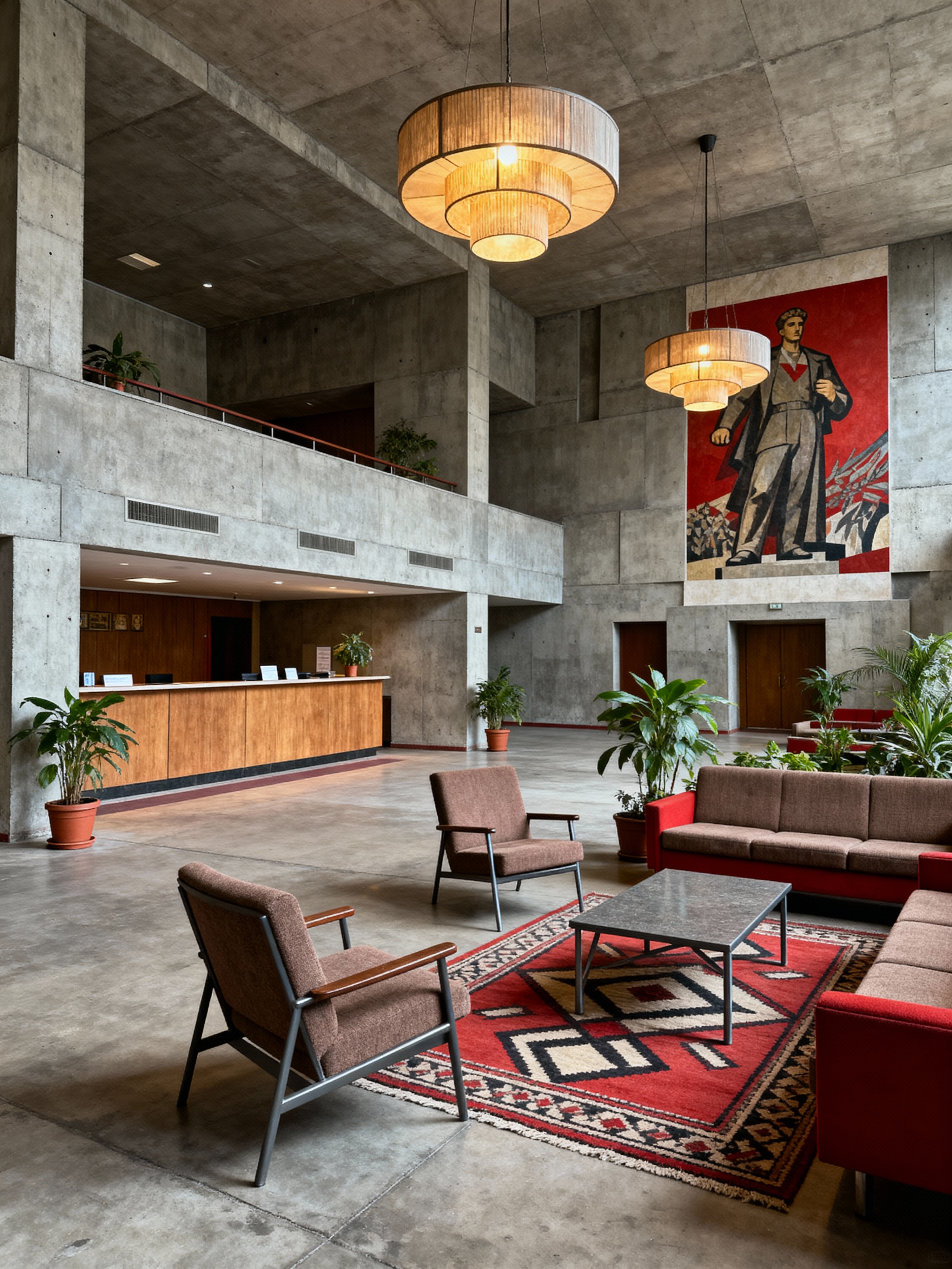 hotel lobby with soviet style with check in desk and hanging lamps and plant and lounge chairs and coffee tables and furniture and rug and sofas. . with brutalist style and soviet-era architecture and utilitarian design and concrete structures and monumental scale and functional furniture and austere aesthetic and socialist realism