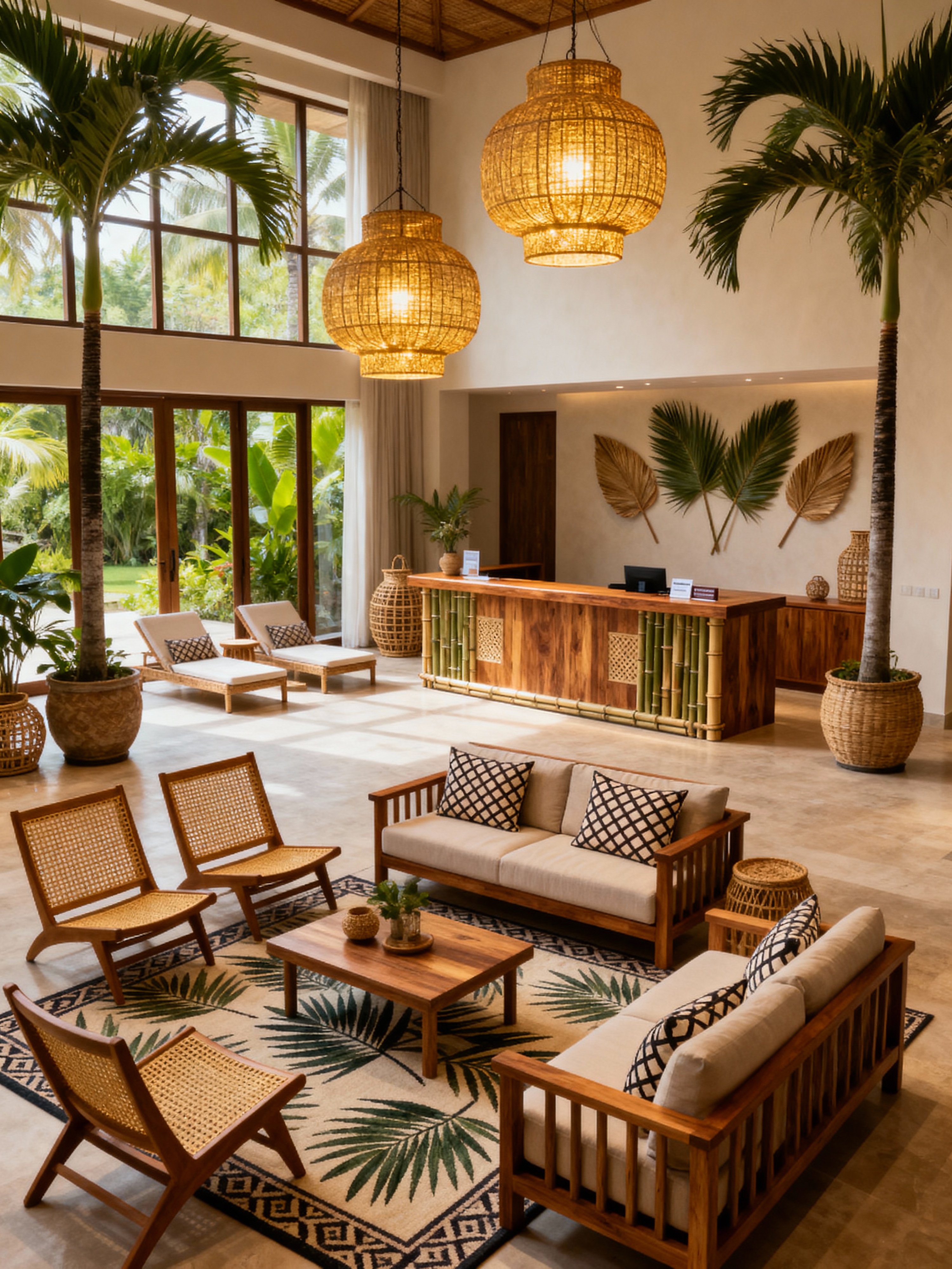 hotel lobby with tropical style with hanging lamps and sofas and plant and lounge chairs and rug and check in desk and furniture and coffee tables. . with palm leaves and lattice prints and teak and palm trees and cane motifs and rattan and bamboo and wicker