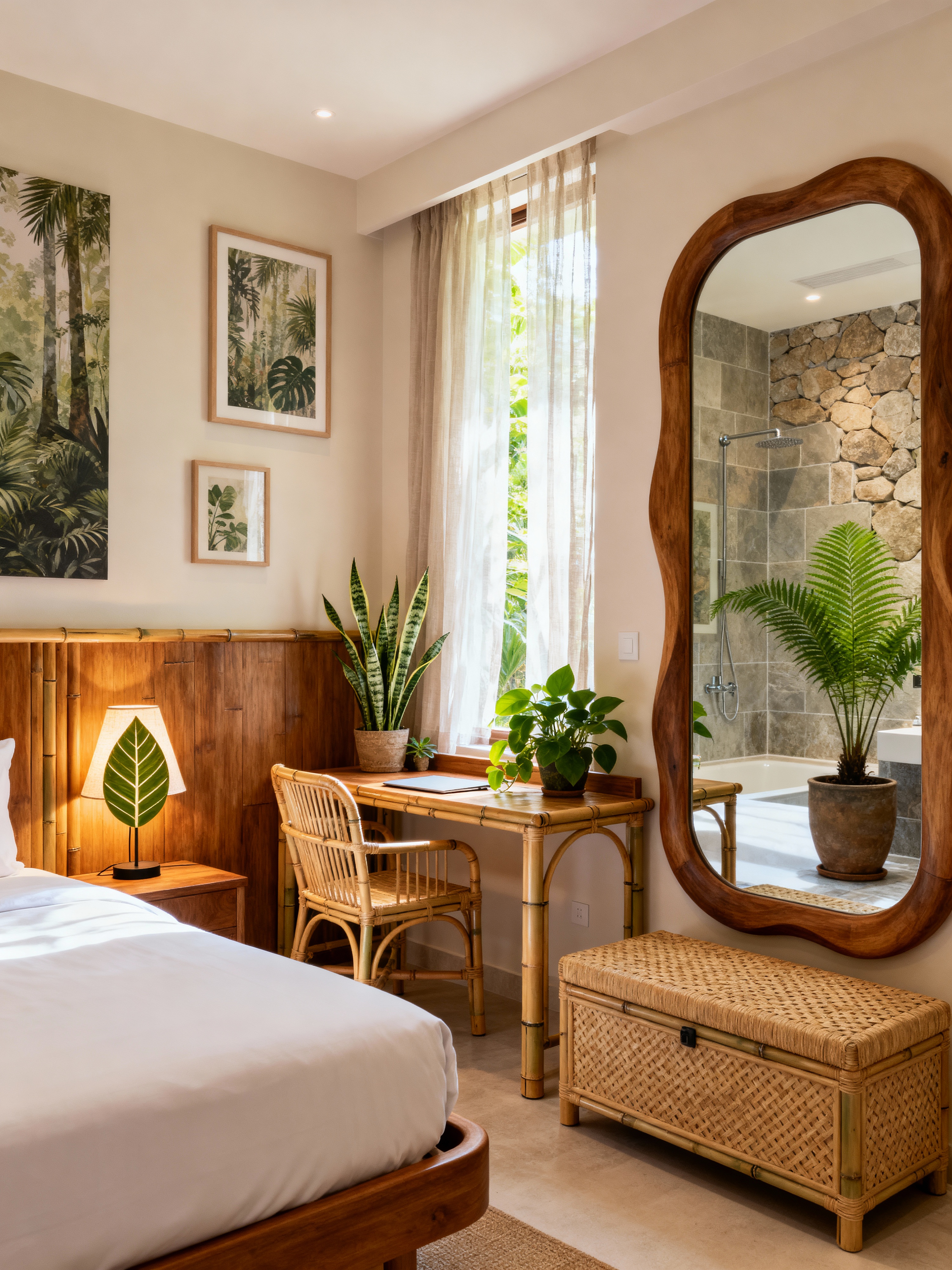 hotel room with biophilic style with plant and hotel bathroom and storage bench or ottoman and mirror and bed and headboard and night light and working desk with desk chair. . with natural environment and images of nature and wood materials and fresh air and plants and bamboo materials and features of nature and natural shapes and forms