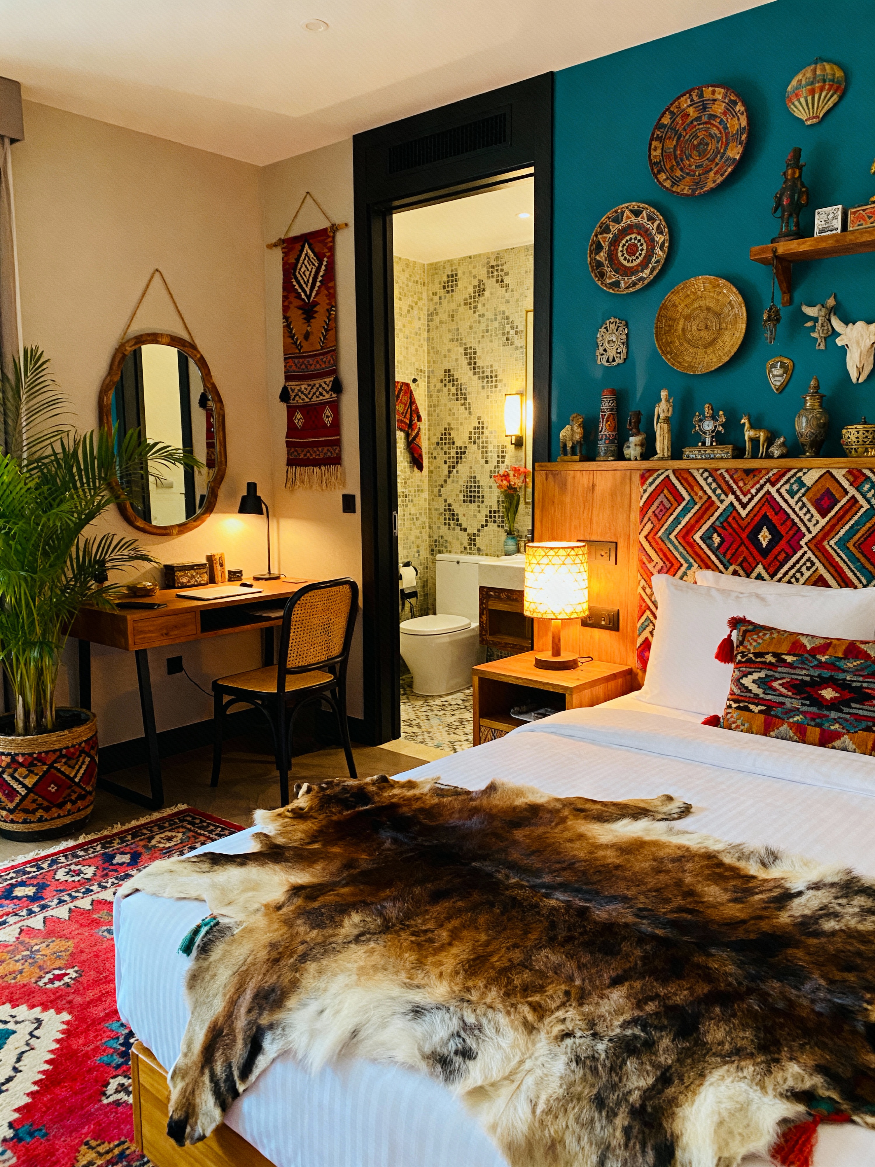 hotel room with bohemian style with bed and night light and working desk with desk chair and bedside table or night stand and headboard and plant and mirror and hotel bathroom. . with playful patterns and mixed patterns and animal hides and travel trinkets and carefree layers of pattern, texture, and color and playful textures and bold colors and woods