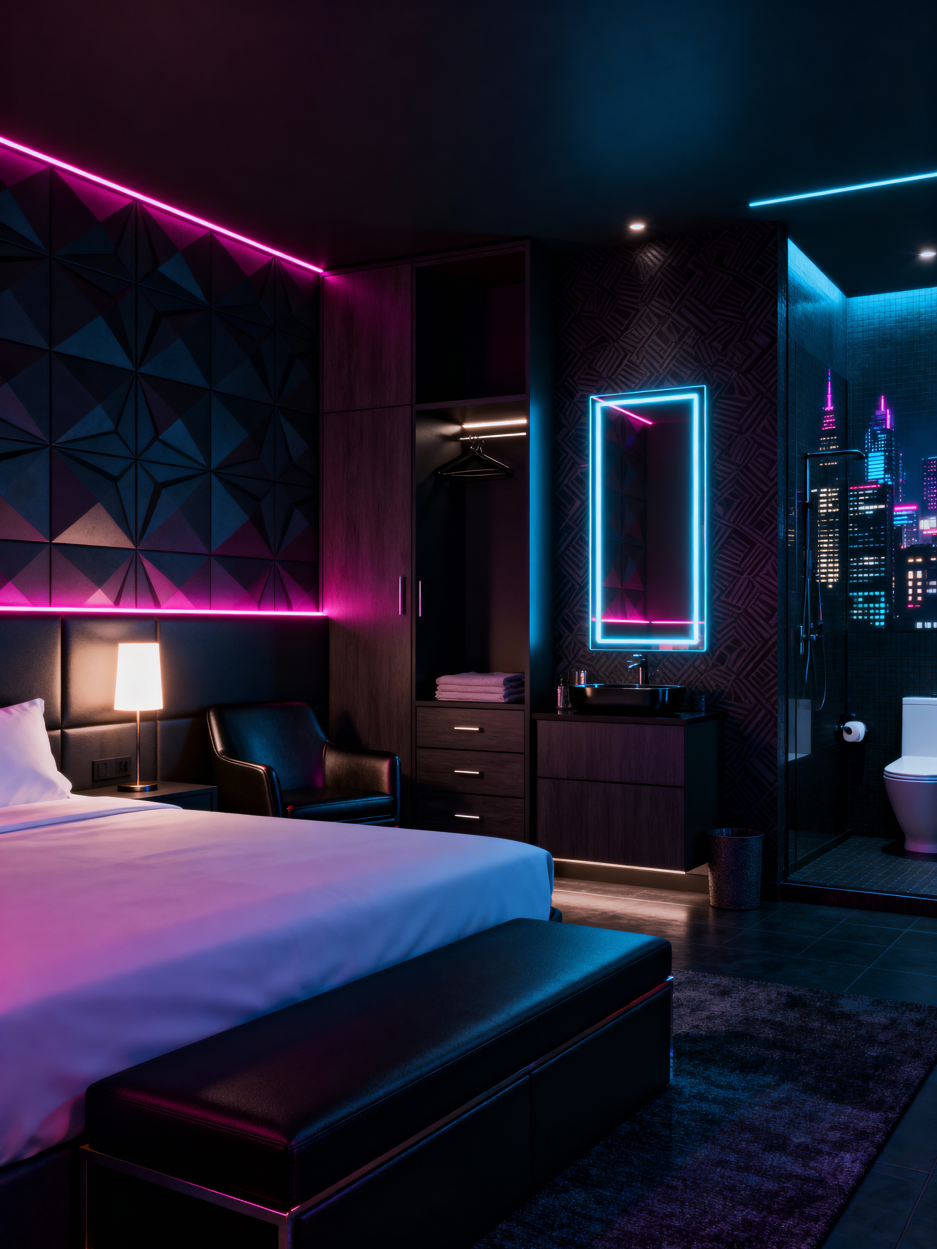hotel room with cyberpunk style with night light and mirror and dresser closet and accent chair and headboard and storage bench or ottoman and bed and hotel bathroom. . with color lights glow and futuristic cybernetic city and black lights and synthetic objects and minimalist and cyberpunk style and dark night and strong geometric walls