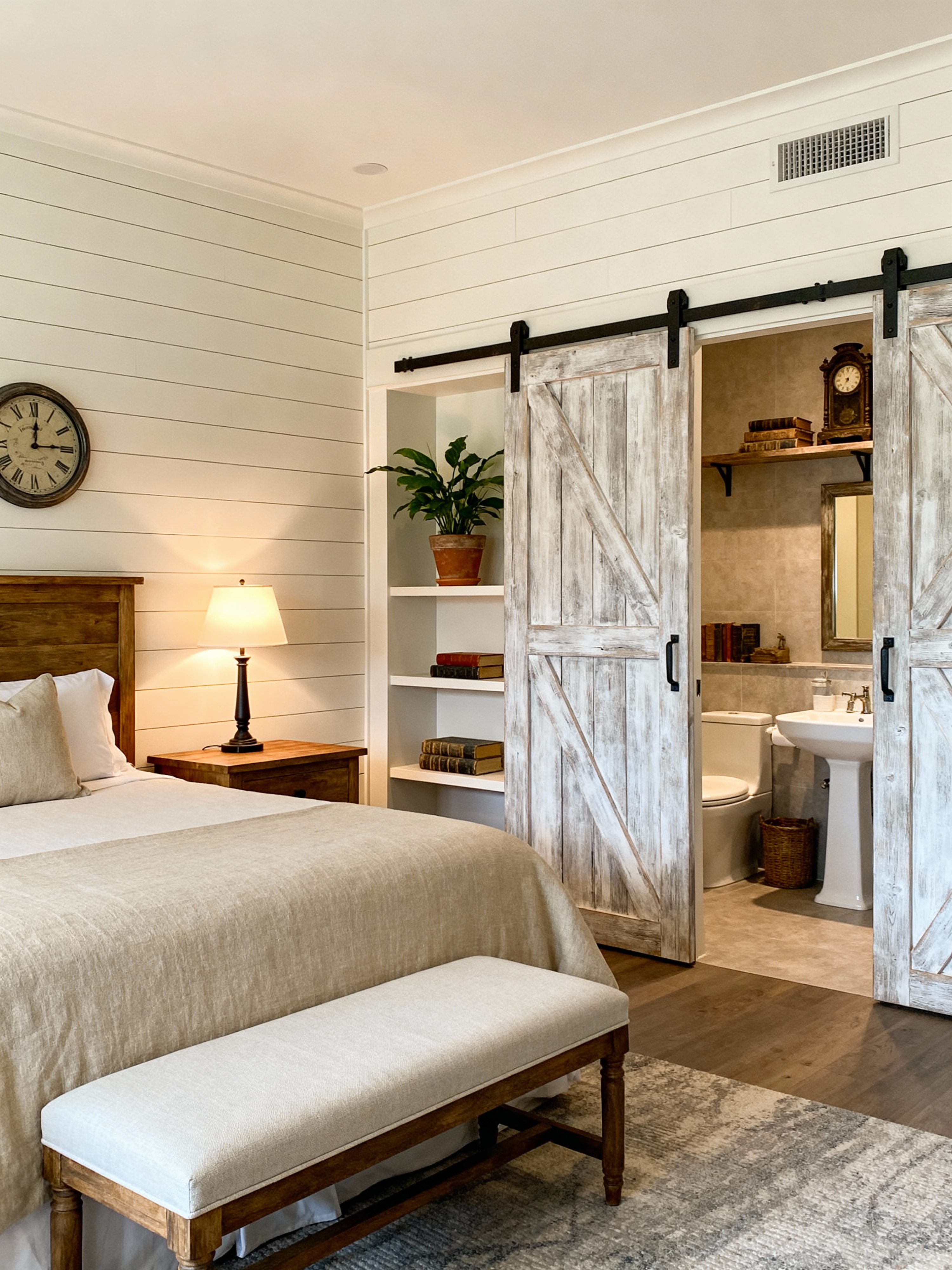 hotel room with farmhouse style with headboard and night light and bedside table or night stand and mirror and plant and storage bench or ottoman and hotel bathroom and bed. . with barn doors and country style and exposed wood and open shelving and vintage decor and shiplap walls and neutral tones and natural textures