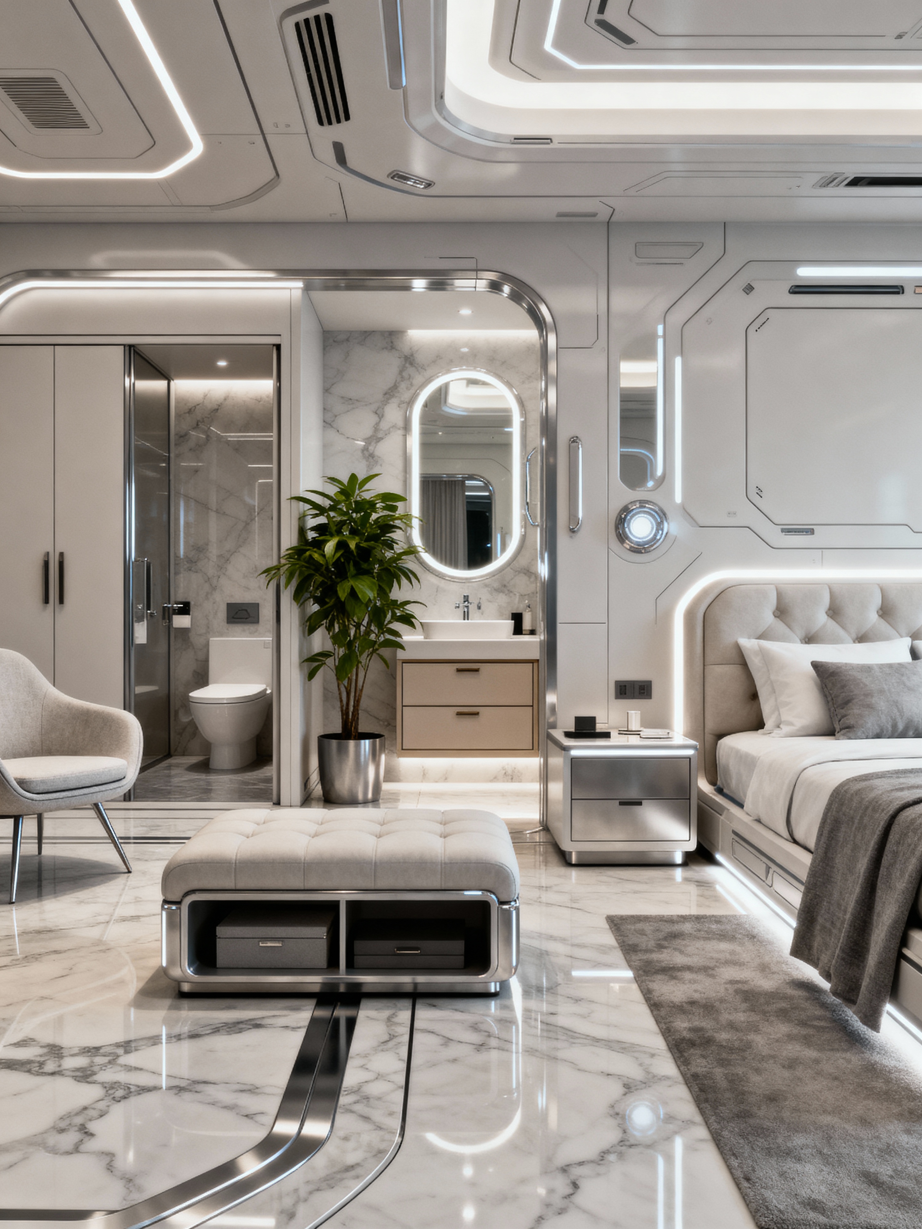hotel room with futuristic style with storage bench or ottoman and plant and headboard and accent chair and hotel bathroom and dresser closet and bedside table or night stand and mirror. . with neutral background and bright accents and futuristic interior and steel finishing and smooth polished marble and monochromatic palette and smooth marble and light colors and spaceship interior