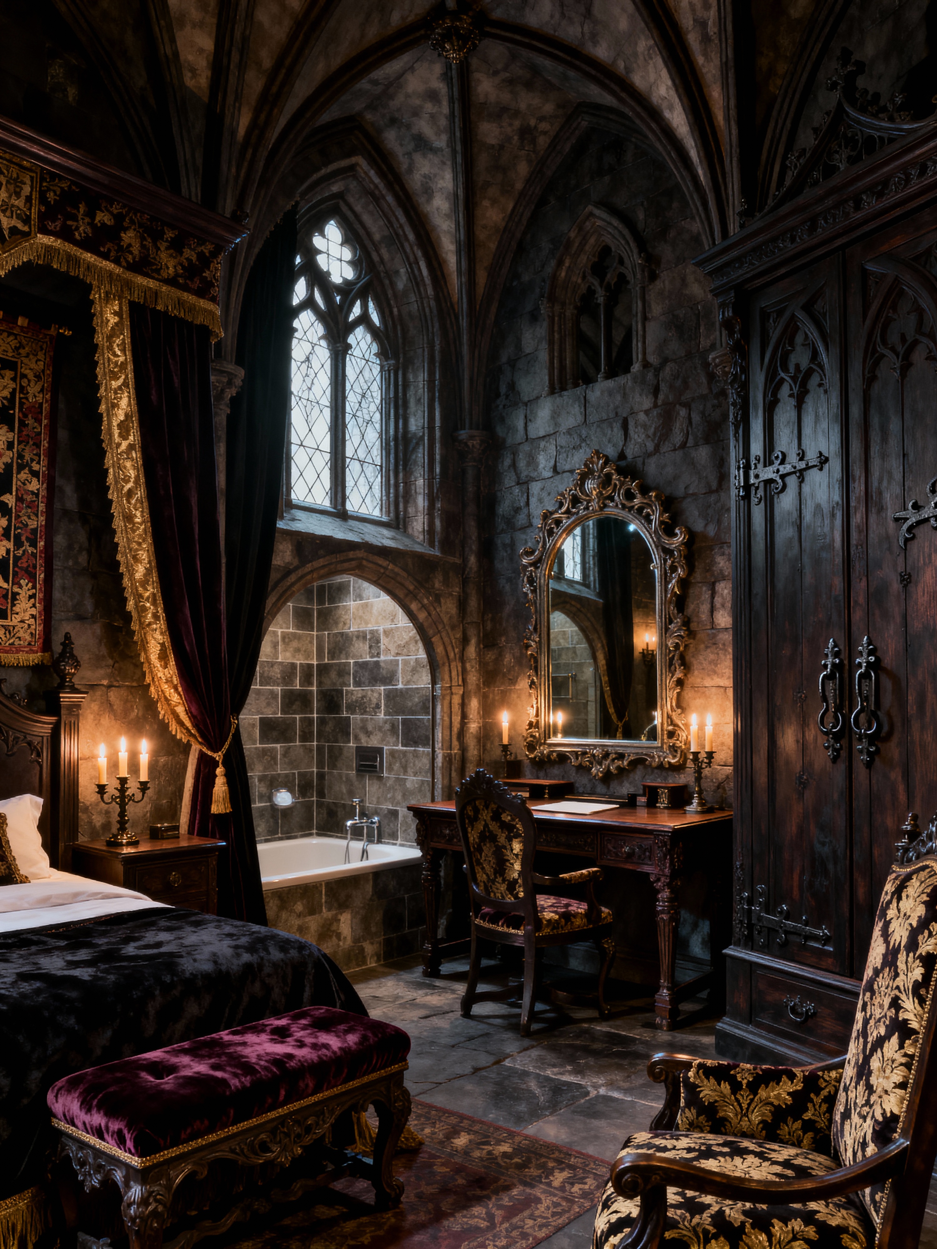 hotel room with gothic style with bedside table or night stand and storage bench or ottoman and working desk with desk chair and headboard and hotel bathroom and accent chair and mirror and dresser closet. . with arched windows and heavy furniture and medieval influence and cathedral style and dramatic atmosphere and candlelit ambiance and mysterious mood and rich fabrics