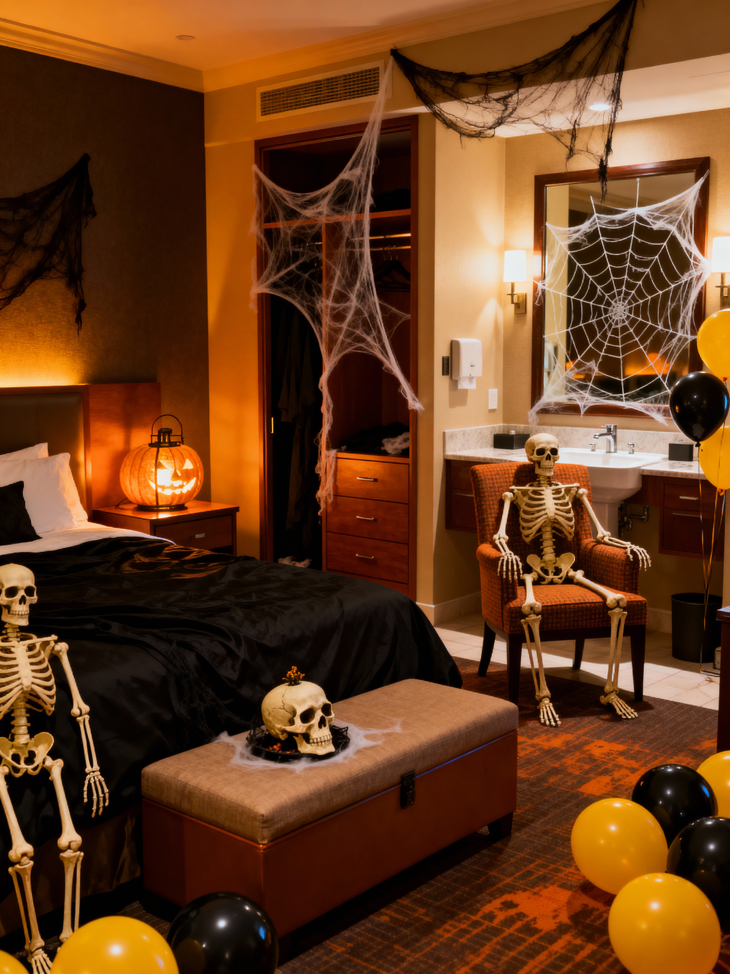 hotel room with halloween style with hotel bathroom and accent chair and night light and storage bench or ottoman and plant and bed and bedside table or night stand and dresser closet. . with cobwebs and human skulls and spiderwebs and yellow black balloons and skeletons sitting and standing and lanterns and glowing pumpkins and cobwebs