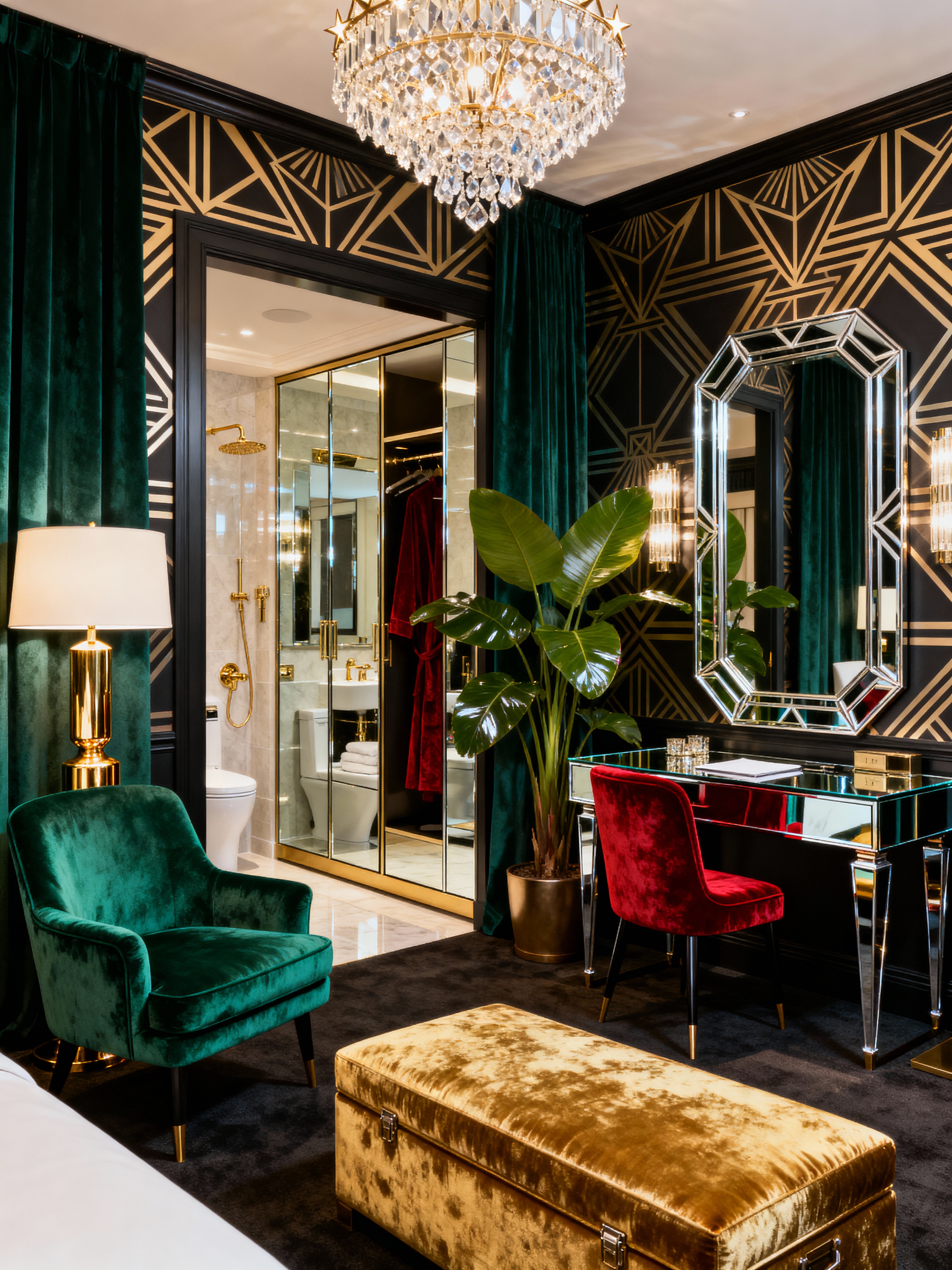 hotel room with hollywood glam style with accent chair and night light and dresser closet and hotel bathroom and plant and working desk with desk chair and mirror and storage bench or ottoman. . with bold colors and mirrored surfaces and star quality and velvet upholstery and art deco influence and luxurious fabrics and metallic accents and crystal chandeliers