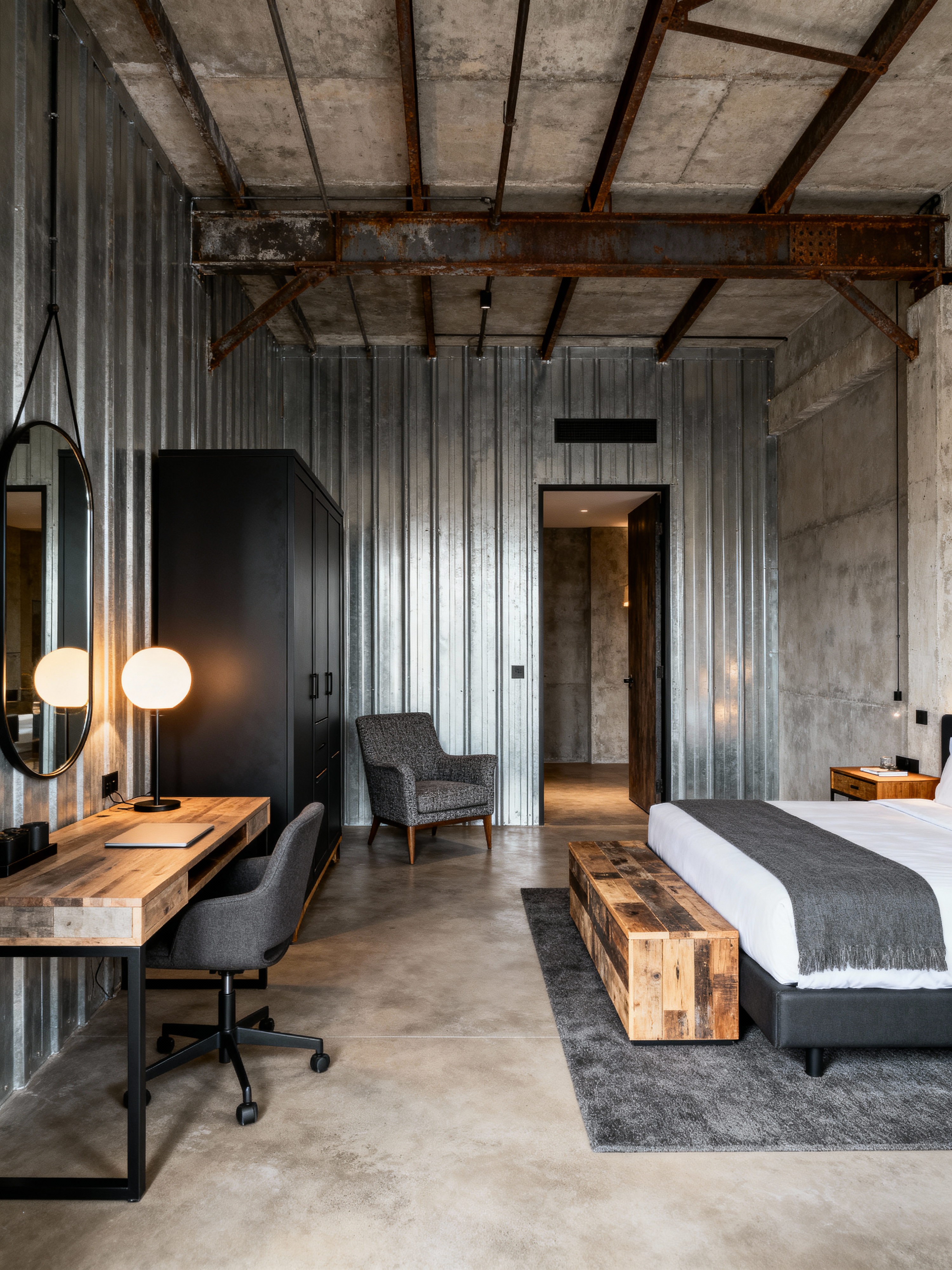 hotel room with industrial style with working desk with desk chair and night light and bed and storage bench or ottoman and dresser closet and accent chair and mirror and bedside table or night stand. . with metal panels and reclaimed wood and exposed concrete and neutral tones and raw aesthetic and factory style and exposed rafters and open floorplan