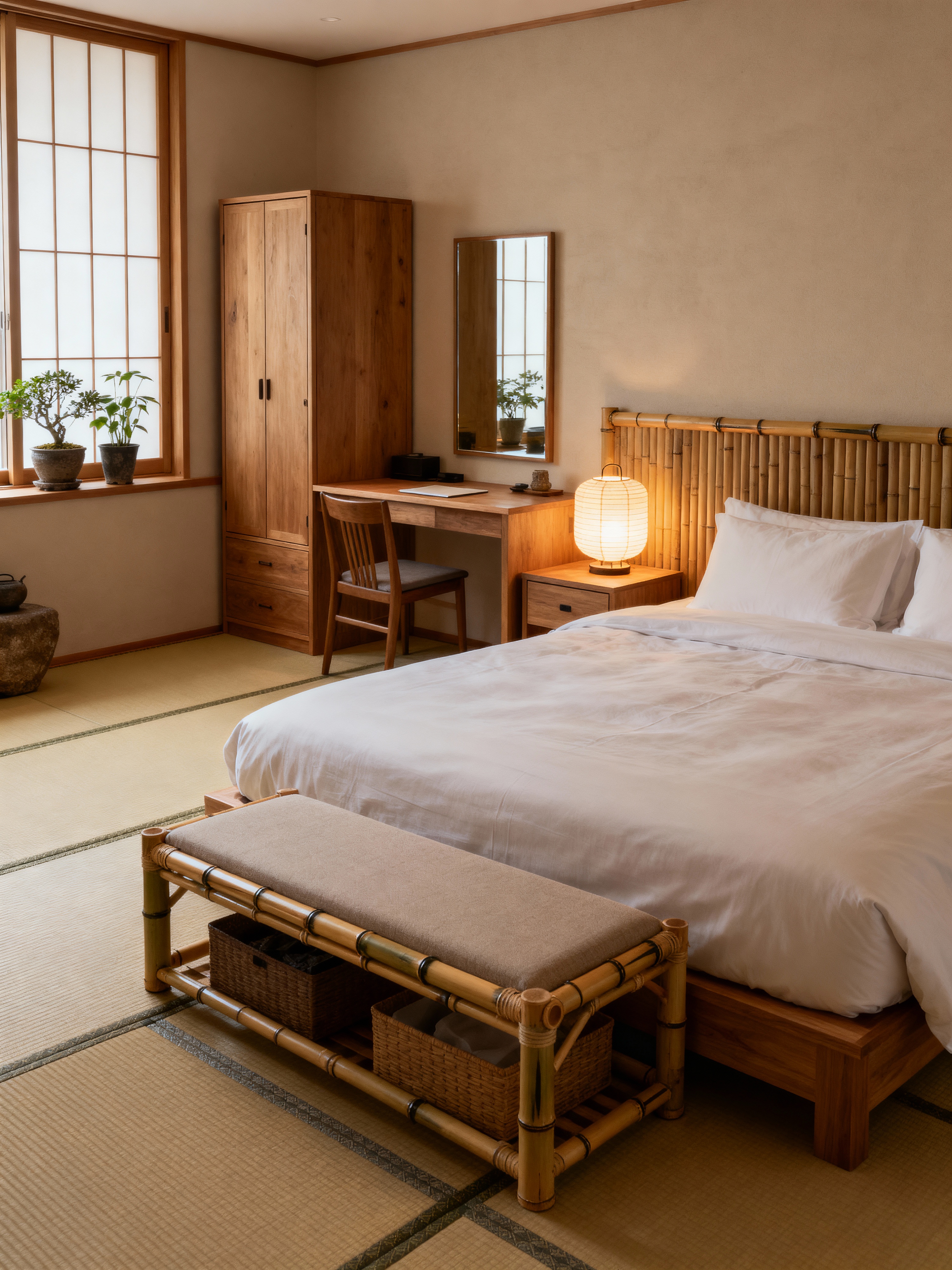 hotel room with japanese design style with plant and dresser closet and night light and headboard and working desk with desk chair and mirror and bedside table or night stand and storage bench or ottoman. . with tatami mats and low furniture and tranquility and bamboo accents and natural materials and neutral colors and wabi-sabi and minimalism