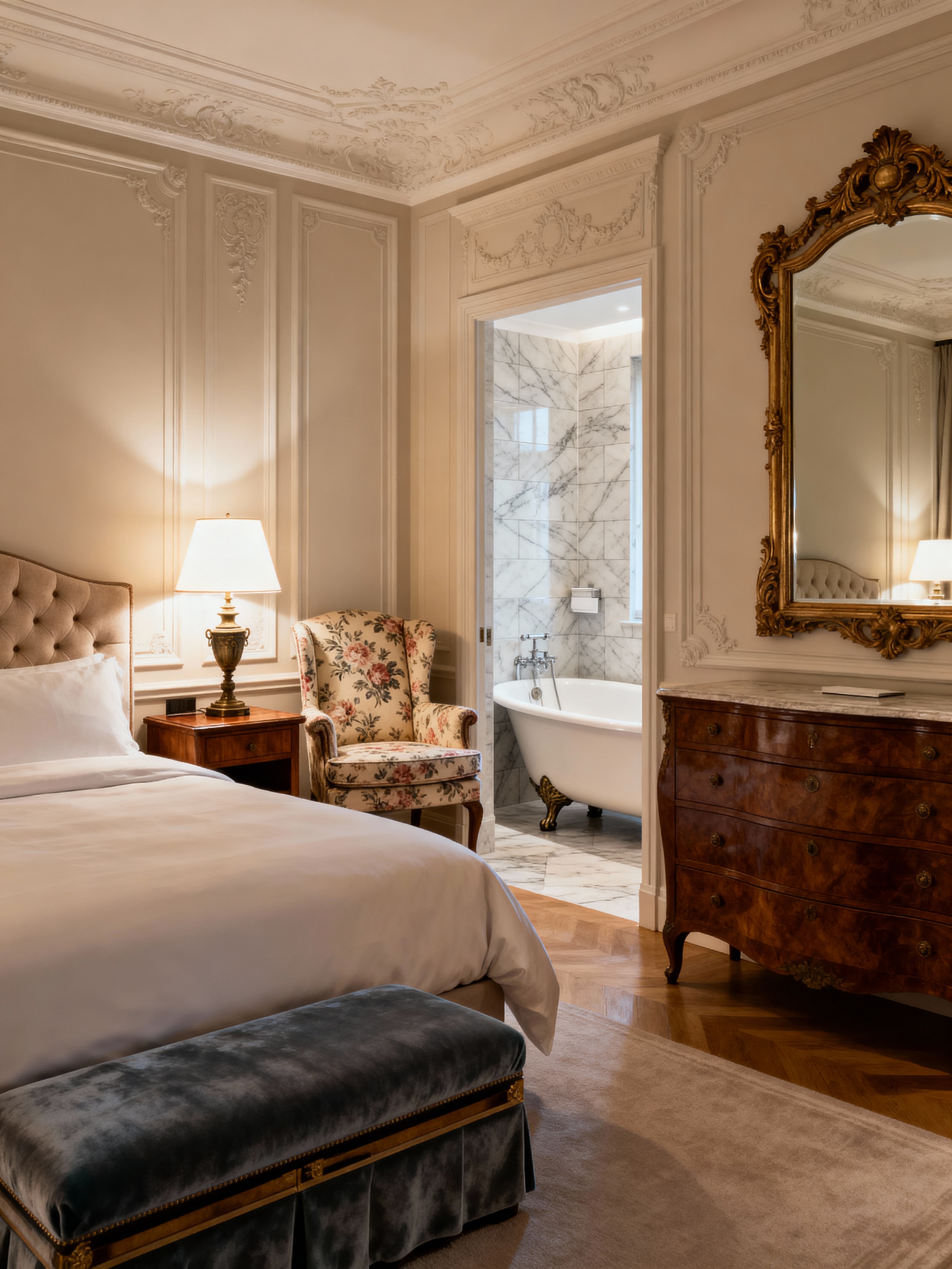 hotel room with parisian style with accent chair and night light and mirror and hotel bathroom and headboard and bedside table or night stand and bed and storage bench or ottoman. . with european flair and french elegance and ornate moldings and chic simplicity and sophisticated charm and classic details and refined style and vintage pieces