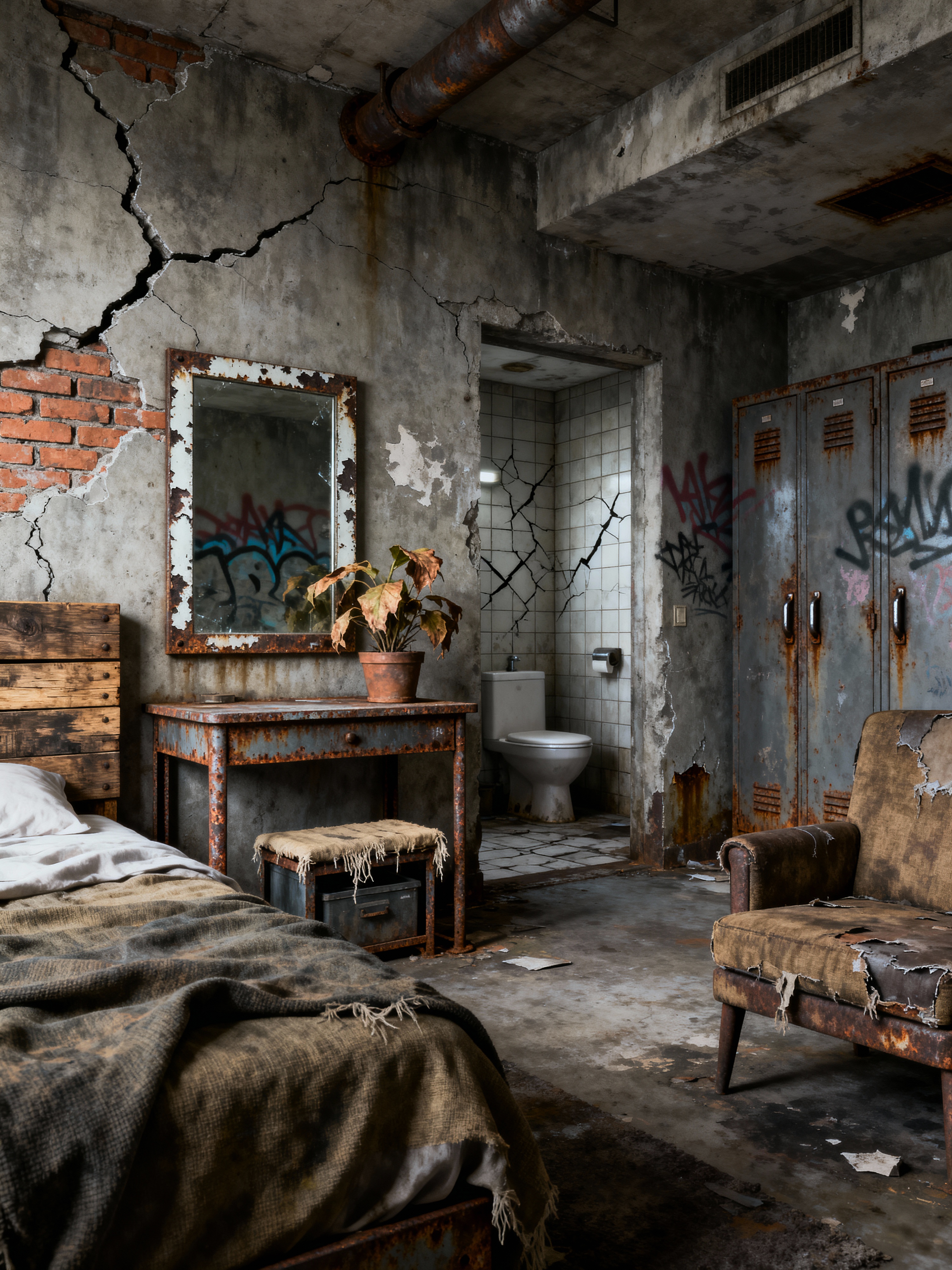 hotel room with post-apocalyptic style with bedside table or night stand and mirror and plant and headboard and storage bench or ottoman and hotel bathroom and dresser closet and accent chair. . with cracked concrete walls and dystopian style and exposed bricks and survival-inspired and graffiti on walls and rusted metal and peeling paint and worn textures