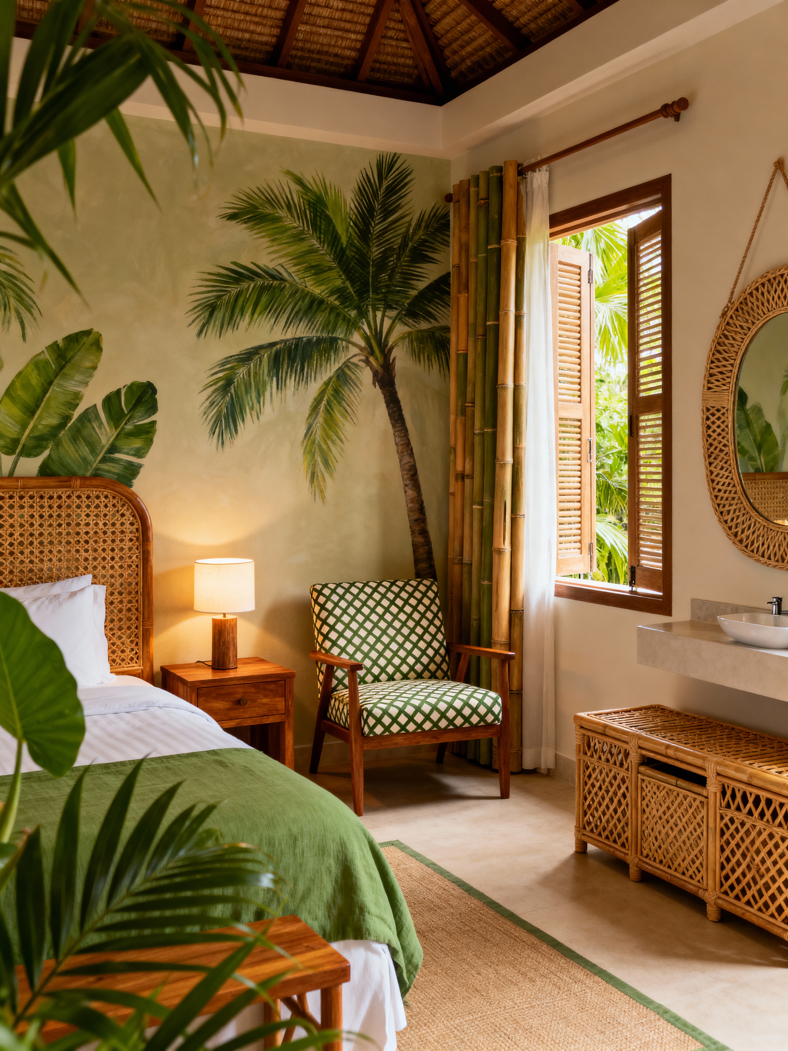 hotel room with tropical style with headboard and accent chair and hotel bathroom and bed and bedside table or night stand and storage bench or ottoman and night light and mirror. . with wicker and lattice prints and teak and palm leaves and bamboo and rattan and cane motifs and palm trees