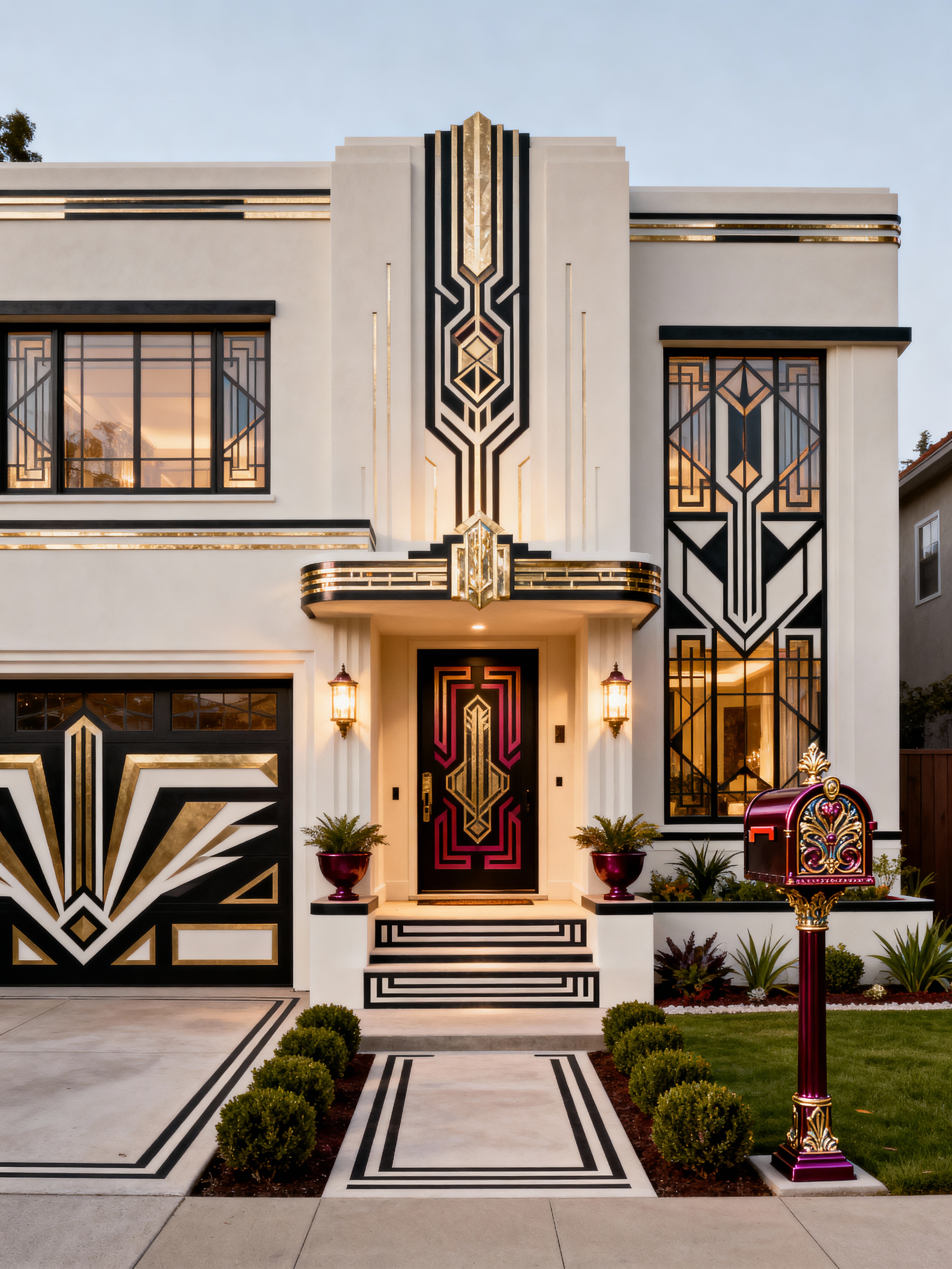 house exterior with art deco style with front door and windows and garage door and steps and landscaping and porch and mailbox and outdoor lighting. . with decadent detail and glamour and abstract patterns and bold geometry and rich colors and geometric lines and symmetrical designs and exuberant shapes