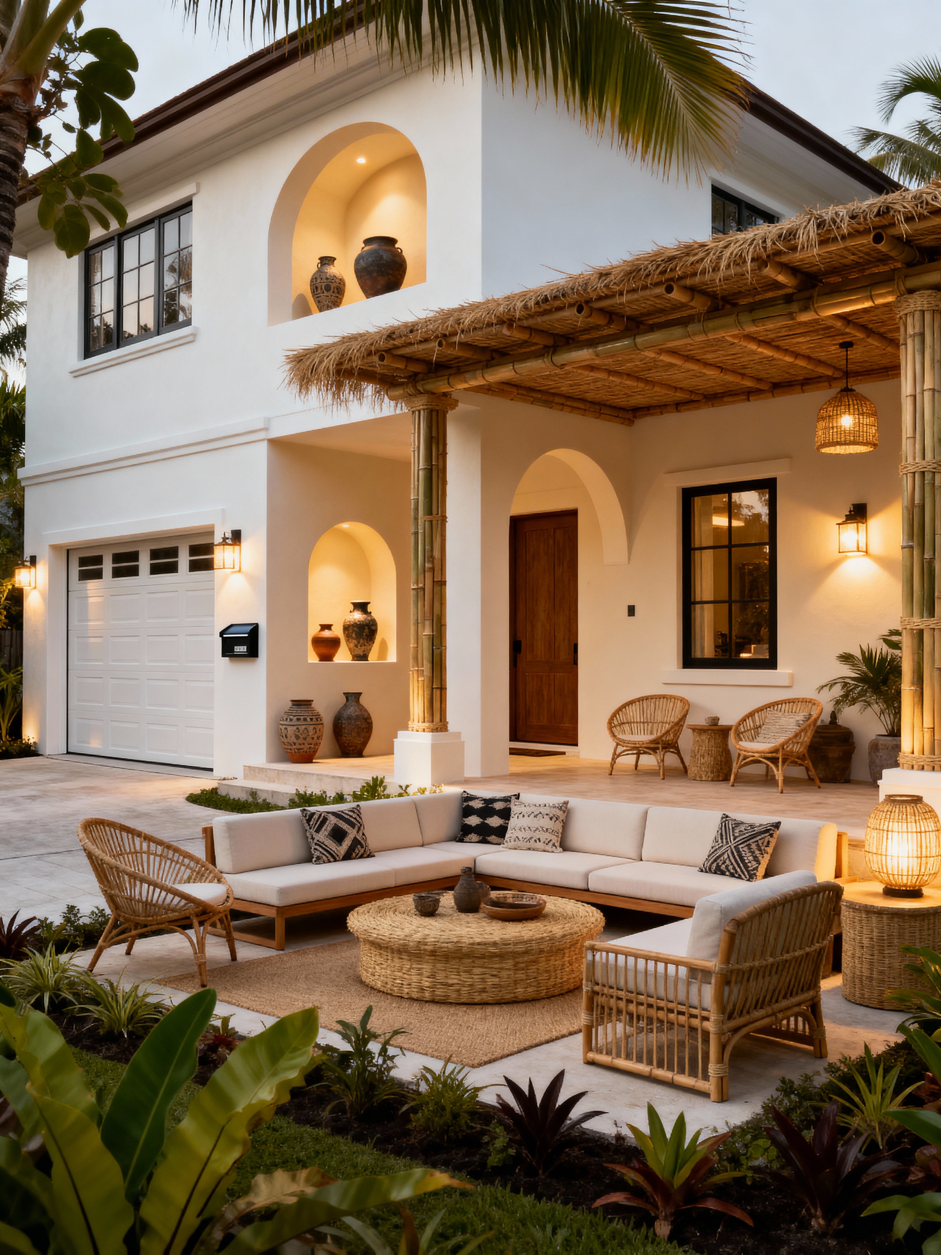 house exterior with bali style with garage door and porch and landscaping and outdoor lighting and front door and driveway and windows and mailbox. . with low modular sofas and modern boho chic and raffia or bamboo accents and arched walls and niches and warm ambient lighting and rattan chairs and decor and white or cream walls and handcrafted pottery and vases