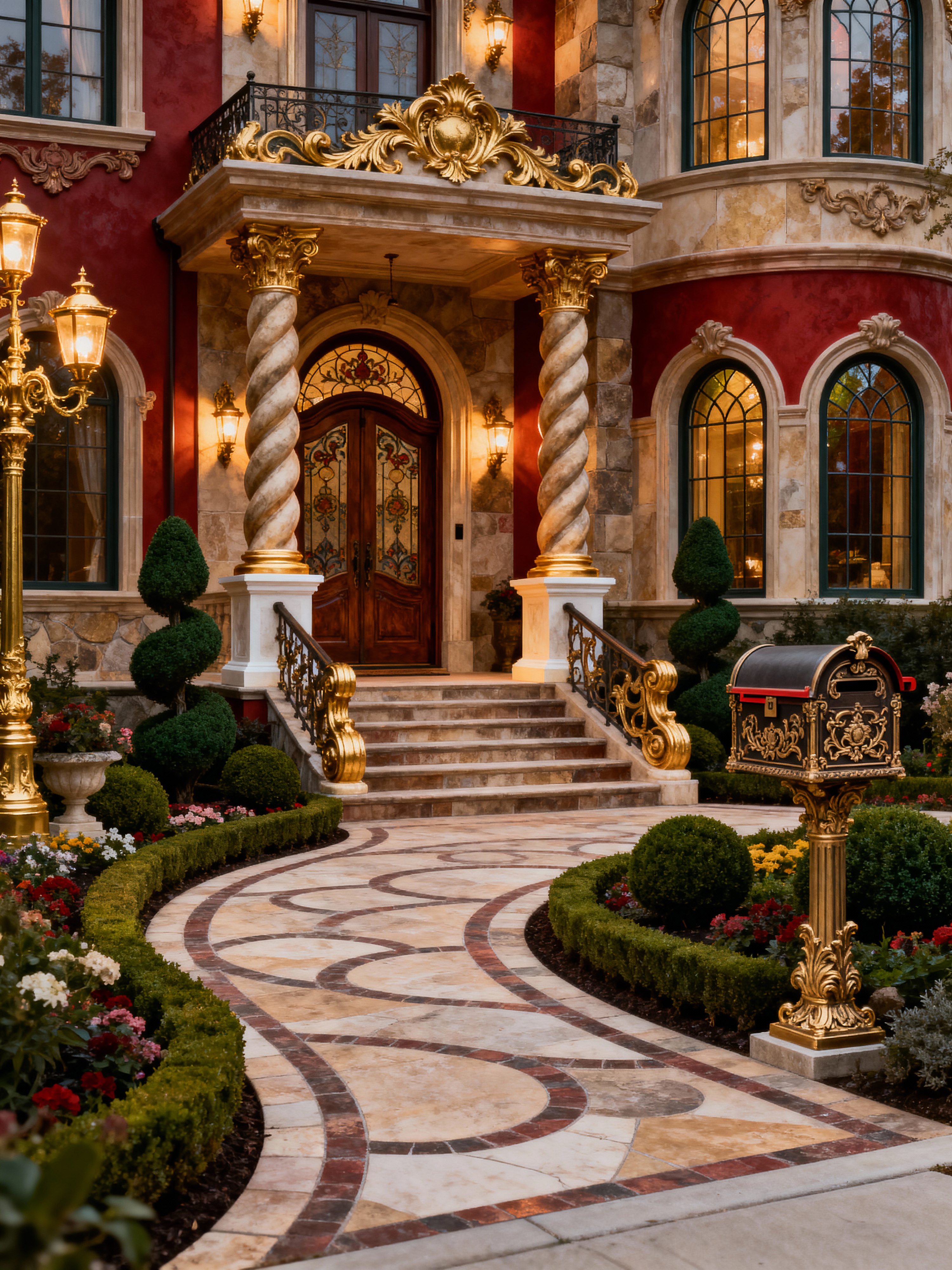 house exterior with baroque style with driveway and landscaping and porch and steps and outdoor lighting and mailbox and front door and windows. . with elaborate ornamentation and sensuous richness and drama and emotional exuberance and dynamism and twisted columns and pedestal feet and movement