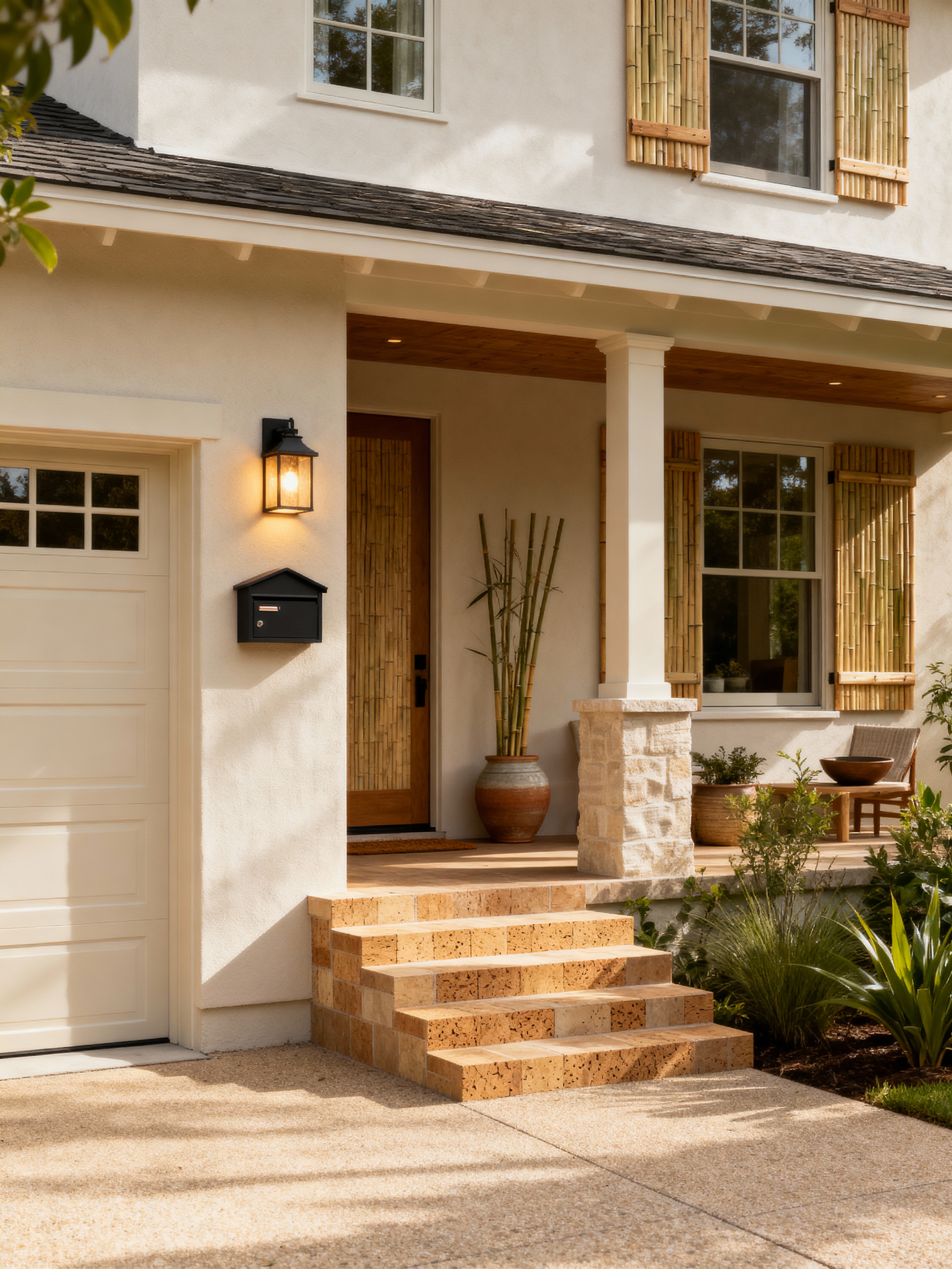 house exterior with biophilic style with outdoor lighting and garage door and mailbox and shutters and steps and windows and porch and driveway. . with linen materials and features of nature and cork materials and natural environment and sunlight and bamboo materials and ceramic materials and natural elements