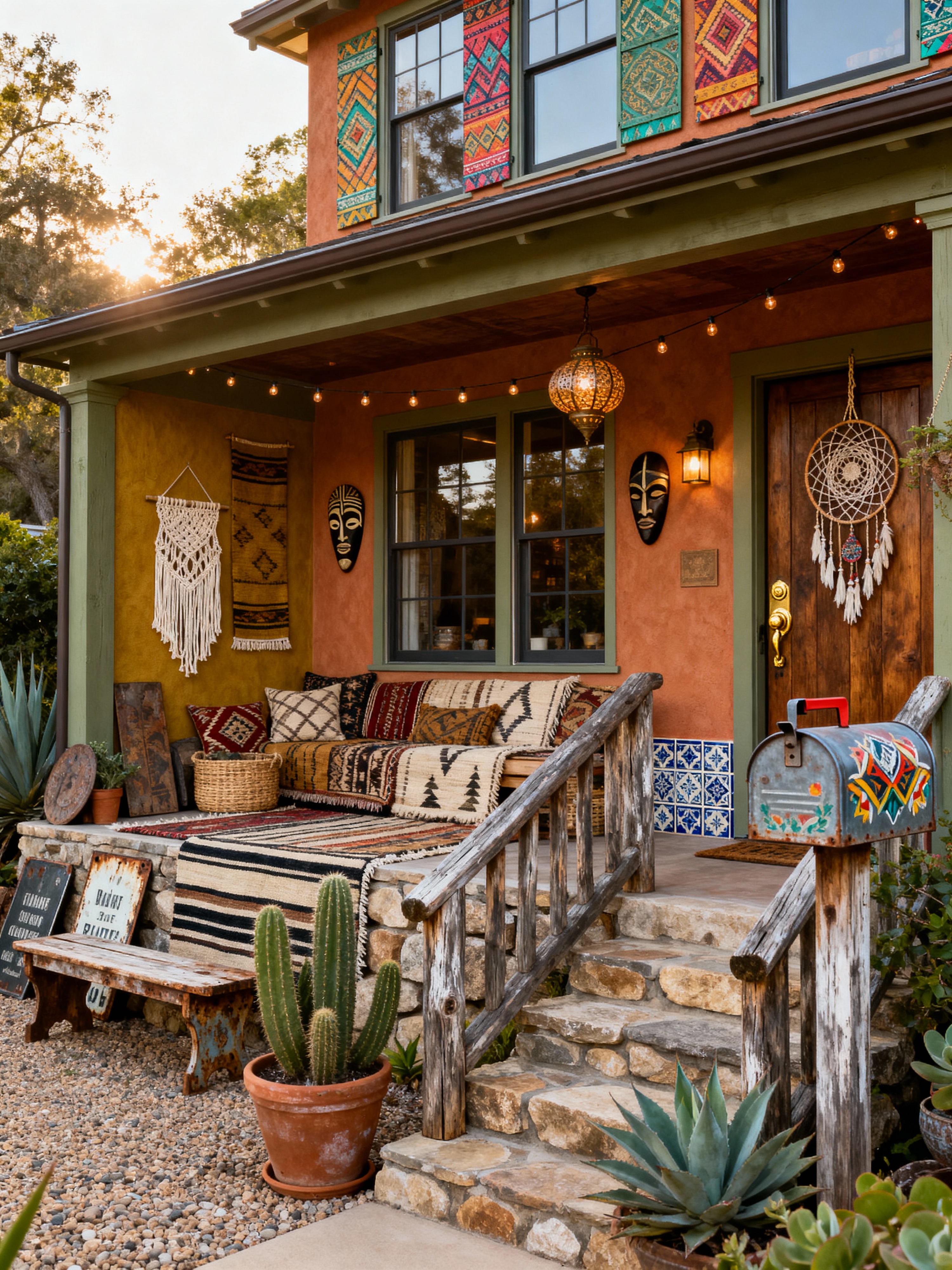 house exterior with boho-chic style with landscaping and steps and windows and porch and driveway and front door and mailbox and outdoor lighting. . with eclectic mix and bohemian flair and earthy colors and layered textiles and natural materials and mixed patterns and global artifacts and vintage finds