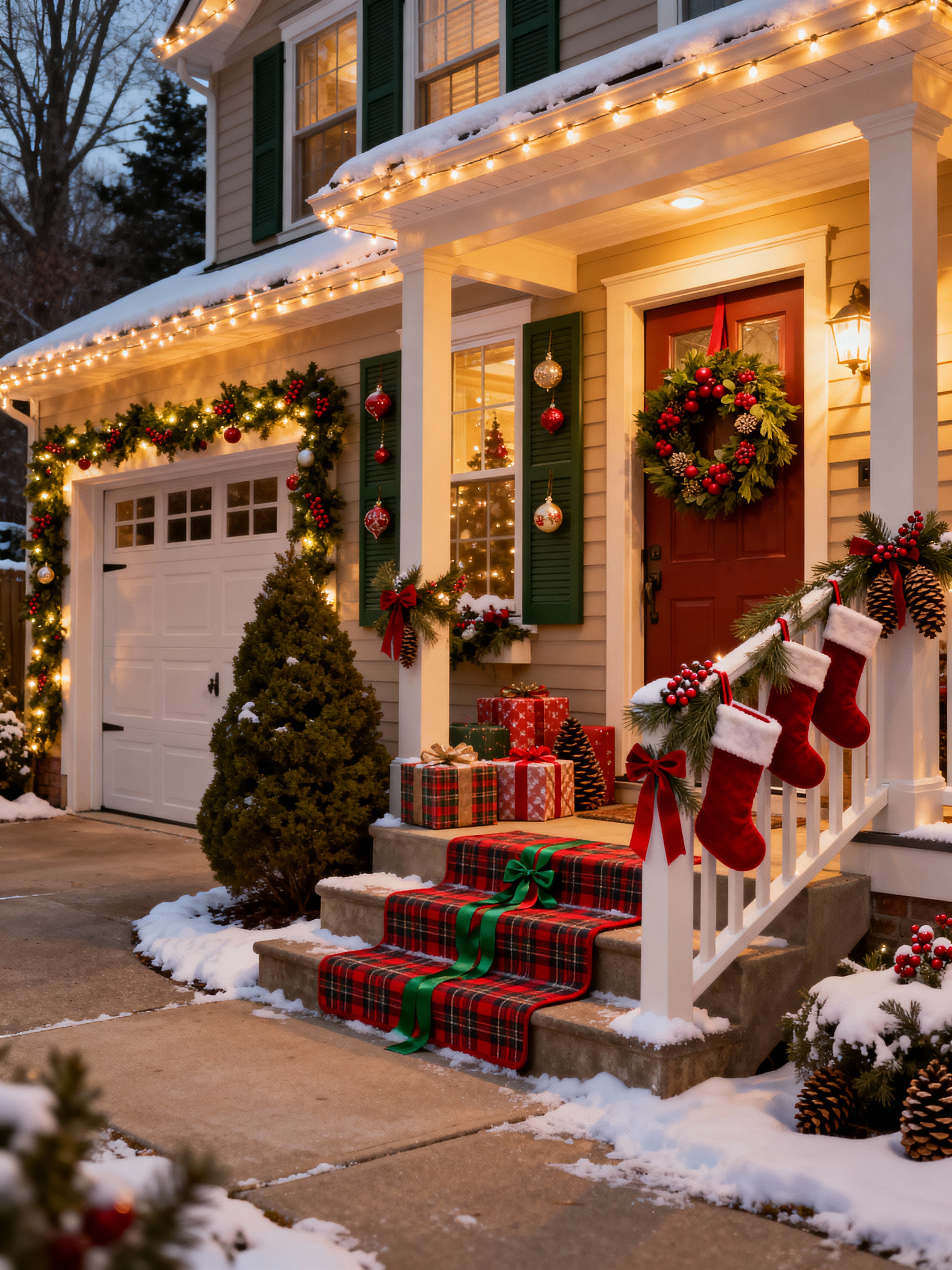 house exterior with christmas style with outdoor lighting and driveway and landscaping and garage door and windows and front door and steps and shutters. . with berries and greenery draped and giftwrapped gifts and a few big socks hanging and christmas ornaments and tie pinecones and berries and snow outside and plaid rugs and ribbons
