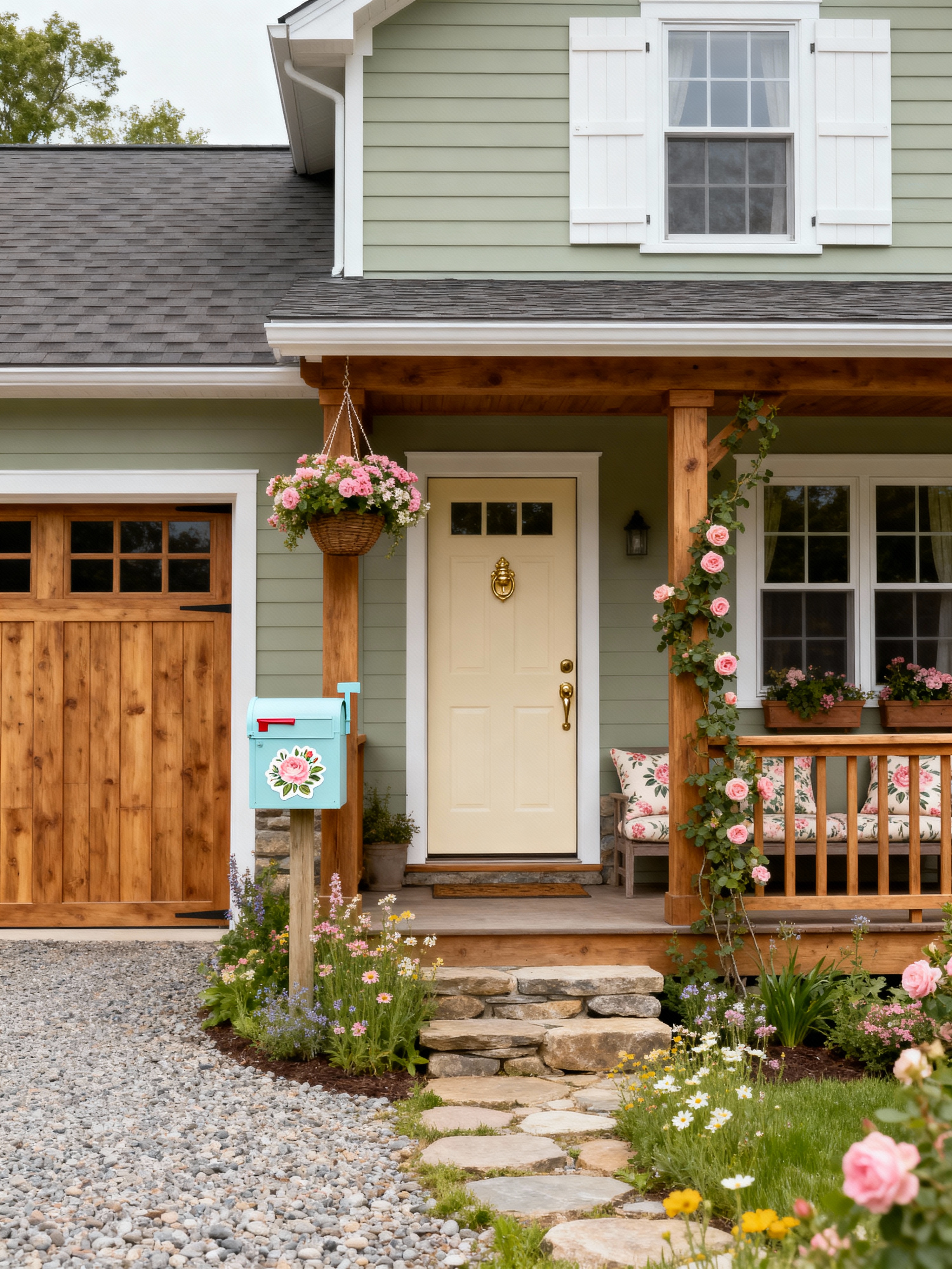 house exterior with cottagecore style with garage door and porch and front door and mailbox and windows and landscaping and steps and driveway. . with natural and country style and rustic and cottage style and floral patterns and muted colors and traditional and earthy