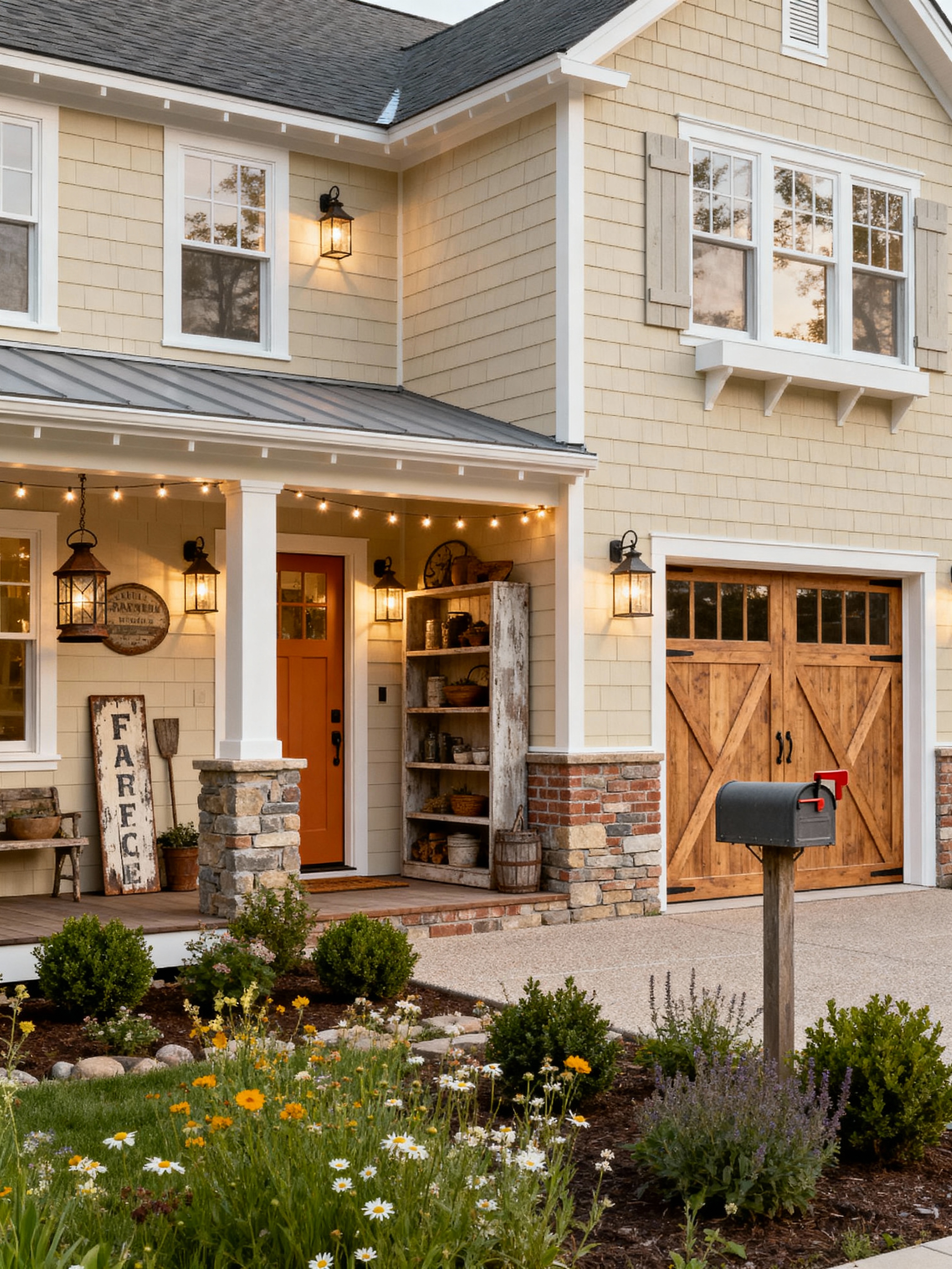 house exterior with farmhouse style with driveway and landscaping and porch and outdoor lighting and mailbox and garage door and windows and front door. . with country style and shiplap walls and open shelving and cozy feel and vintage decor and natural textures and neutral tones and barn doors