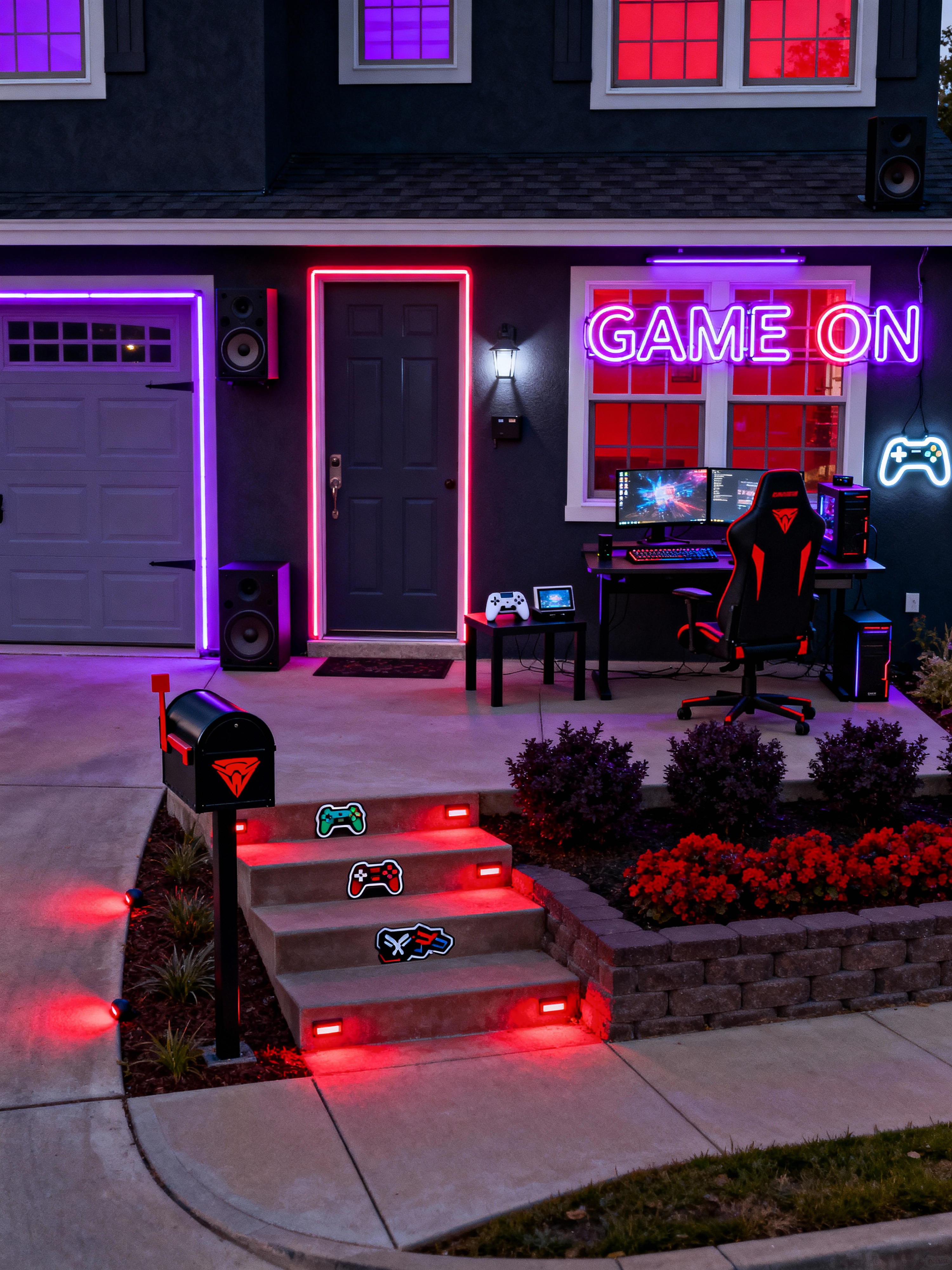 house exterior with gaming room style with garage door and driveway and landscaping and steps and mailbox and front door and outdoor lighting and windows. . with at night and purple and red lights and speakers and gaming chair and video game consoles and computer desk with computer displays and keyboard and dark room and neon letters on wall