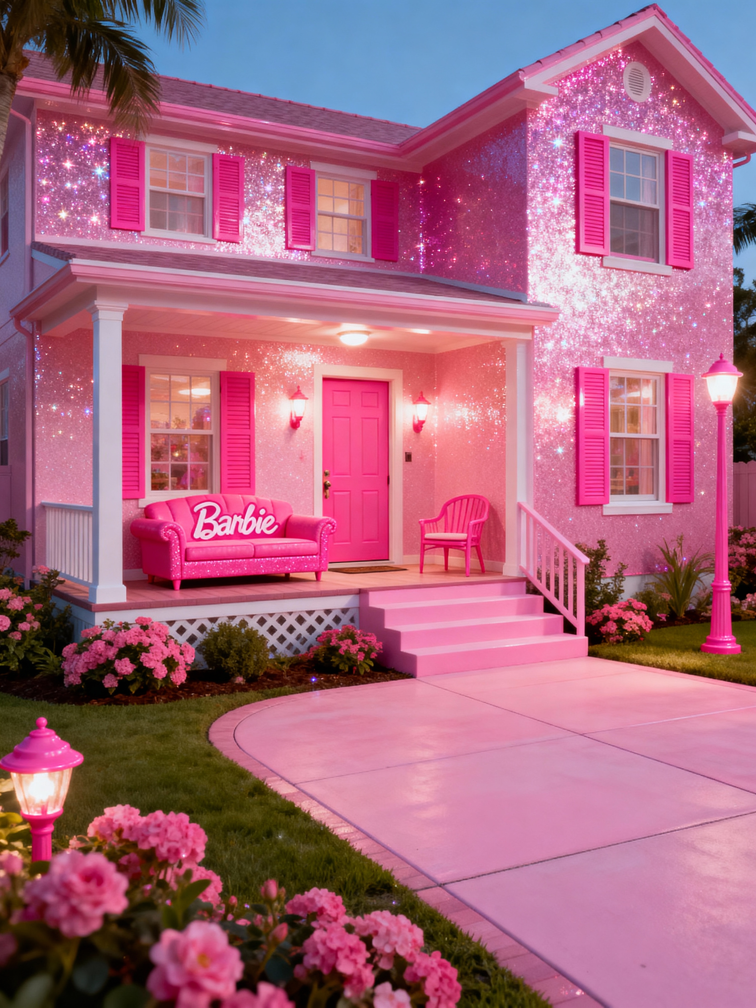 house exterior with hot pink style with porch and front door and shutters and steps and driveway and landscaping and outdoor lighting and windows. . with hot pink barbie colors and barbie style exterior and barbie sofa and hot pink barbie walls and barbie glitter and sparkle and barbie chairs and barbie closet and barbie plastic exterior