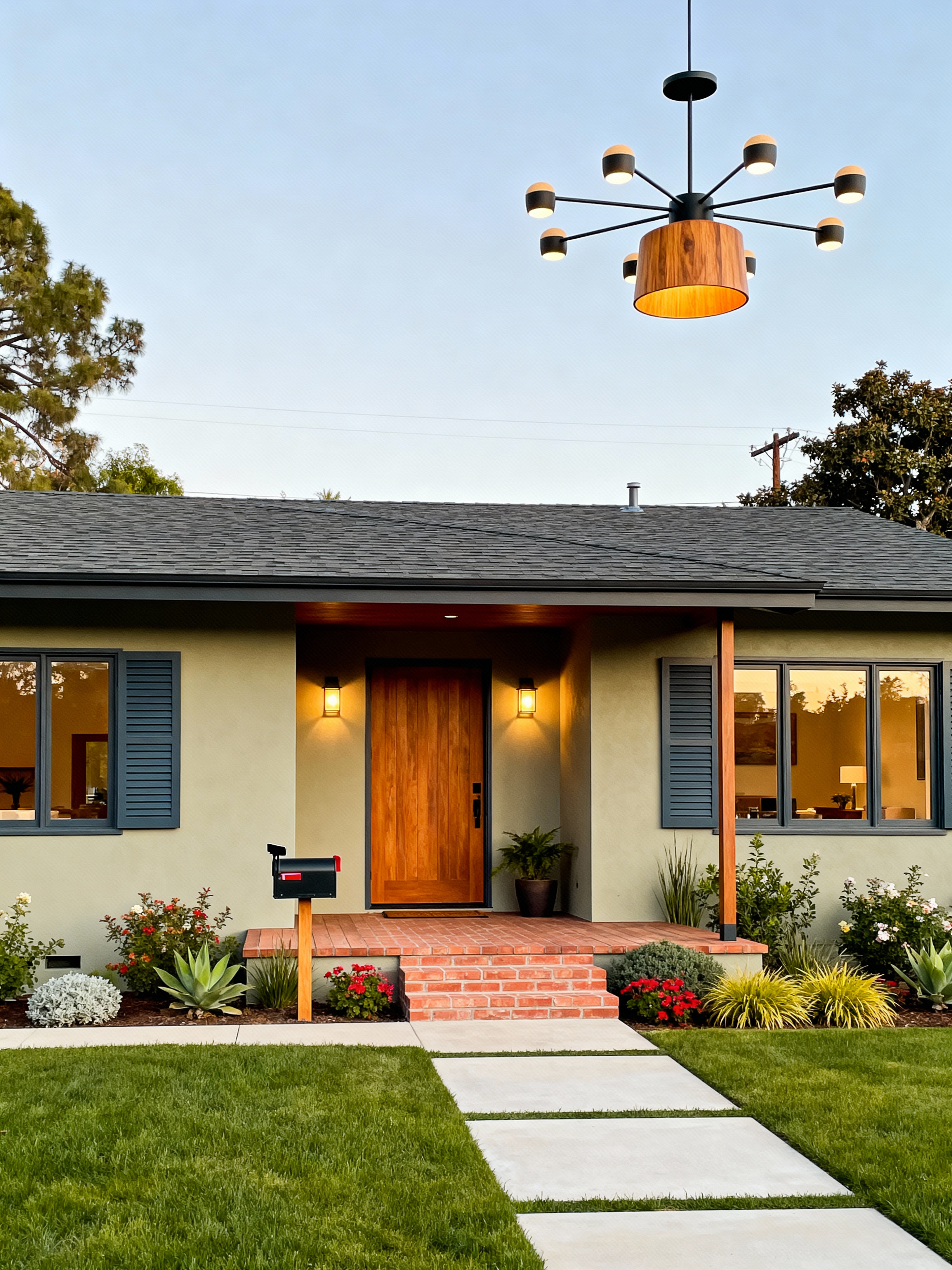 house exterior with midcentury modern style with landscaping and porch and front door and windows and outdoor lighting and mailbox and steps and shutters. . with function over form and muted tones and mid century modern mobile chandelier and vibrant colors and minimalist and natural and manmade materials and wood pendant light mid century modern chandelier and clean lines