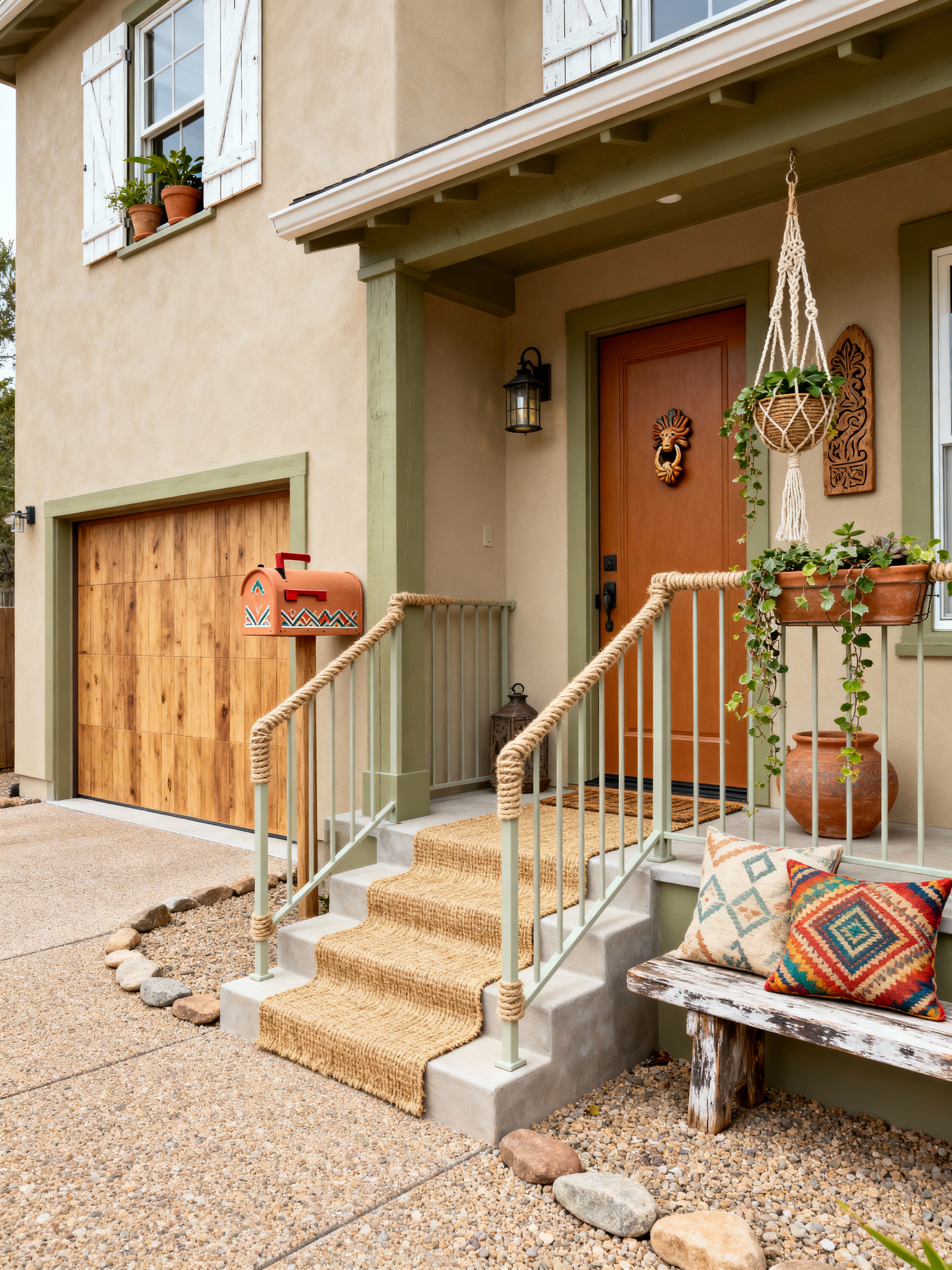 house exterior with modern boho style with garage door and driveway and windows and steps and porch and mailbox and shutters and front door. . with artistic decor and woven textures and jute rugs and comfortable and minimalist and earthy tones and handcrafted items and unique finds