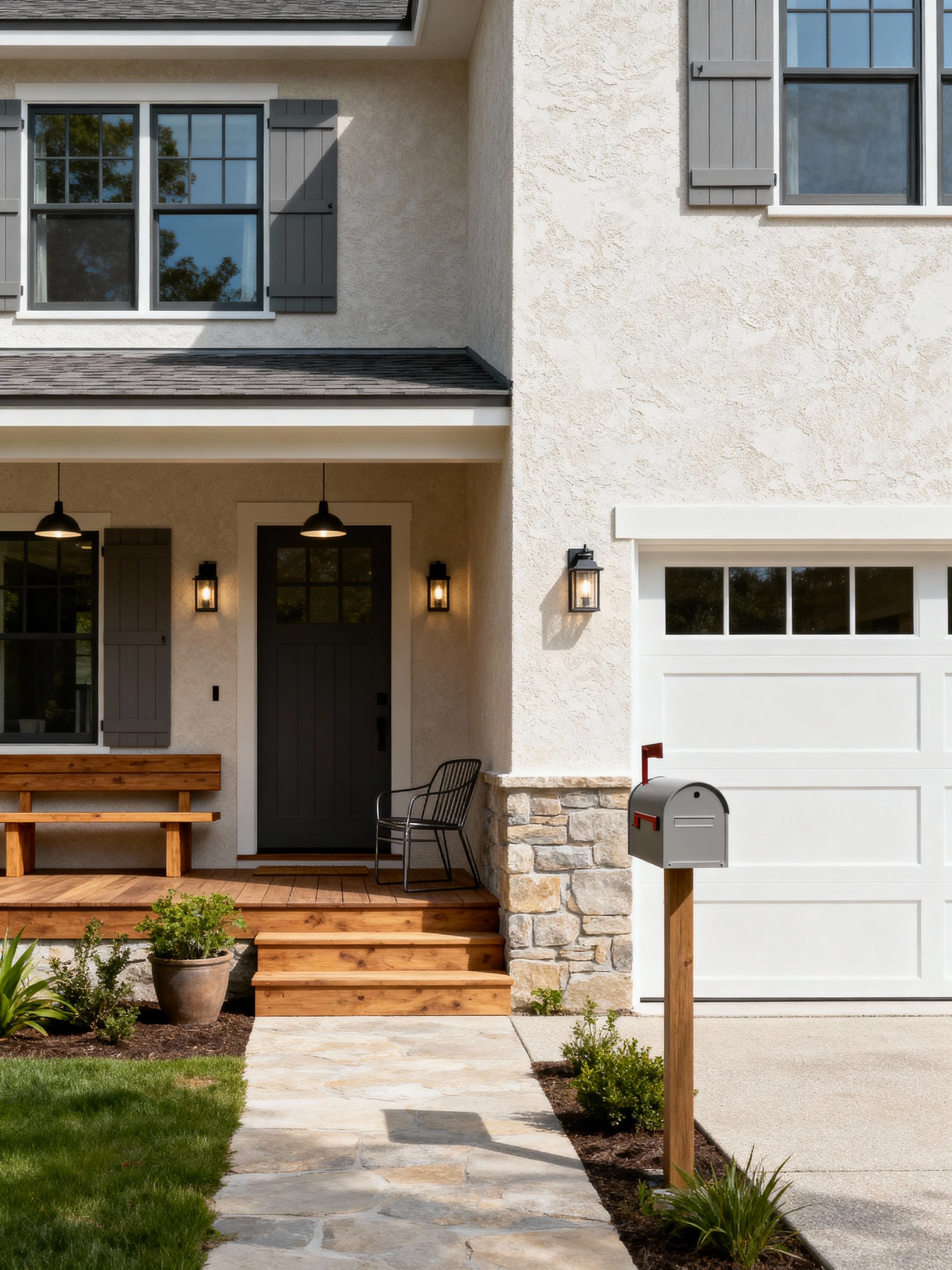 house exterior with modern style with porch and outdoor lighting and steps and shutters and garage door and driveway and mailbox and windows. . with natural materials and elements and open and natural lighting and practicality and functionality and neutral walls and textures and simple, clean lines and simplistic furniture and natural materials and elements