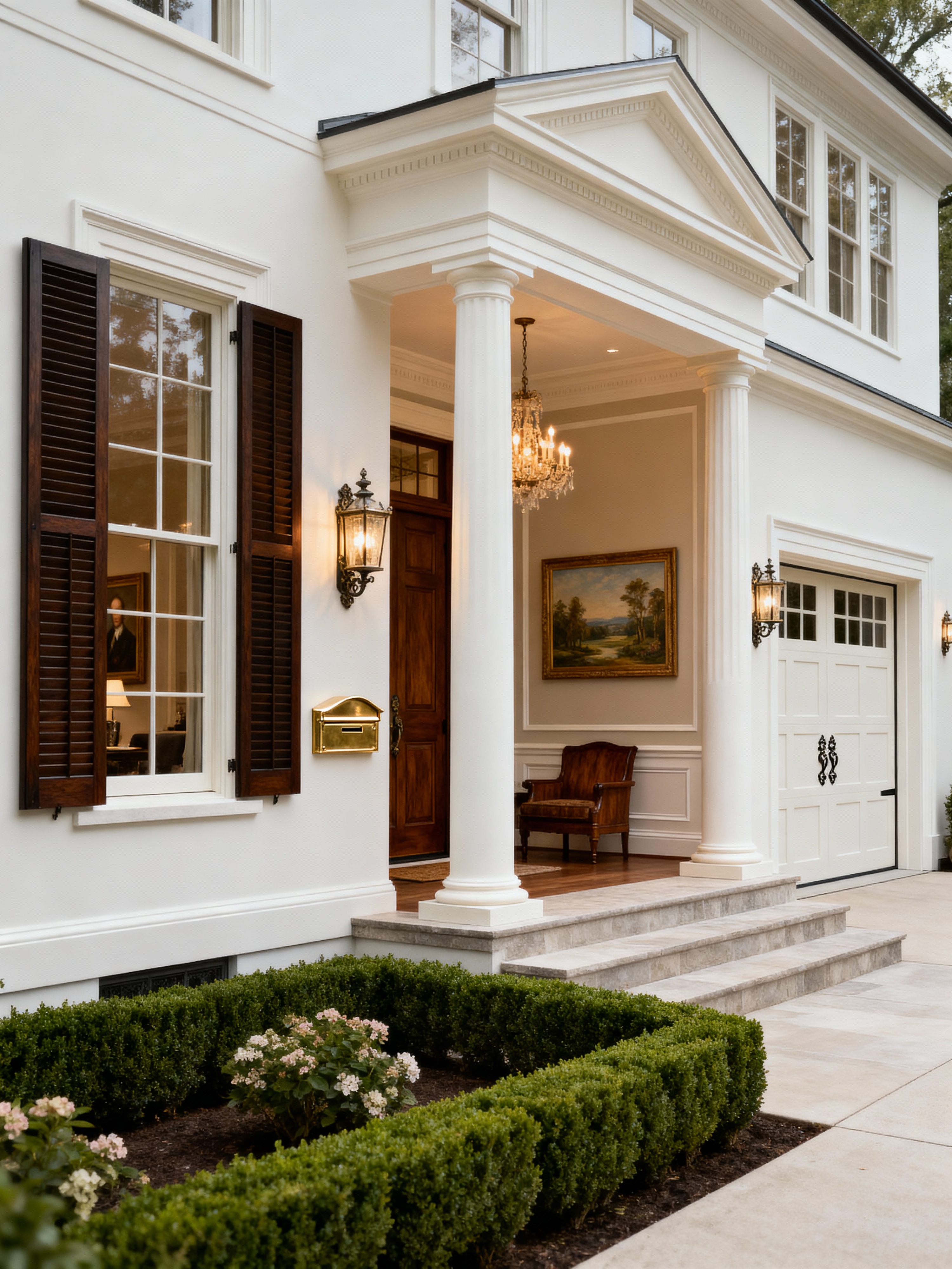 house exterior with neoclassic style with windows and shutters and mailbox and outdoor lighting and garage door and porch and steps and landscaping. . with elegant and sophisticated and spacious rooms and timeless furniture and greek columns and thoughtful minimalism and classical architectural details and high ceilings and timeless artwork
