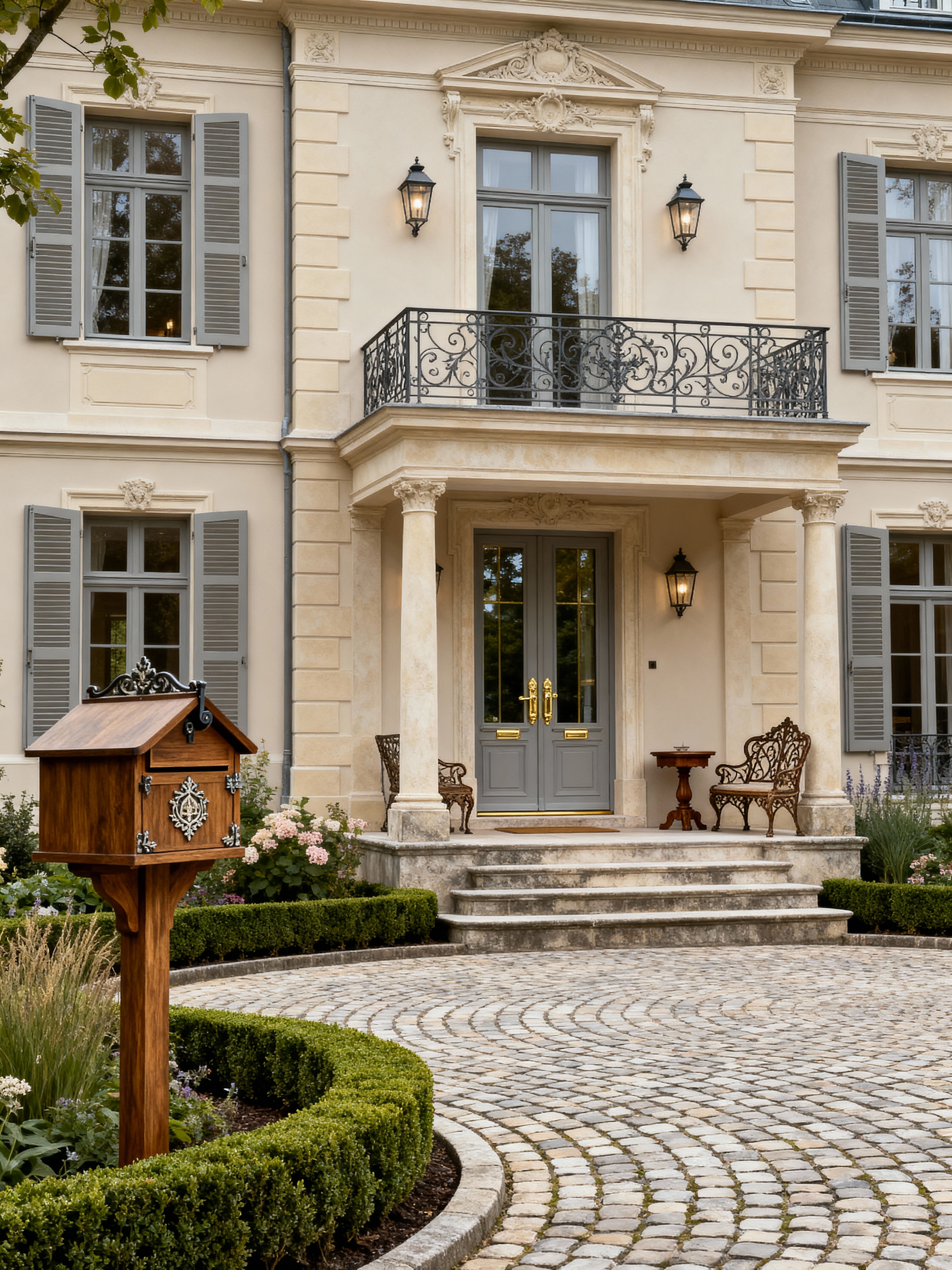 house exterior with parisian style with driveway and mailbox and porch and front door and steps and windows and outdoor lighting and landscaping. . with ornate moldings and refined style and timeless beauty and neutral palette and vintage pieces and european flair and antique furniture and sophisticated charm