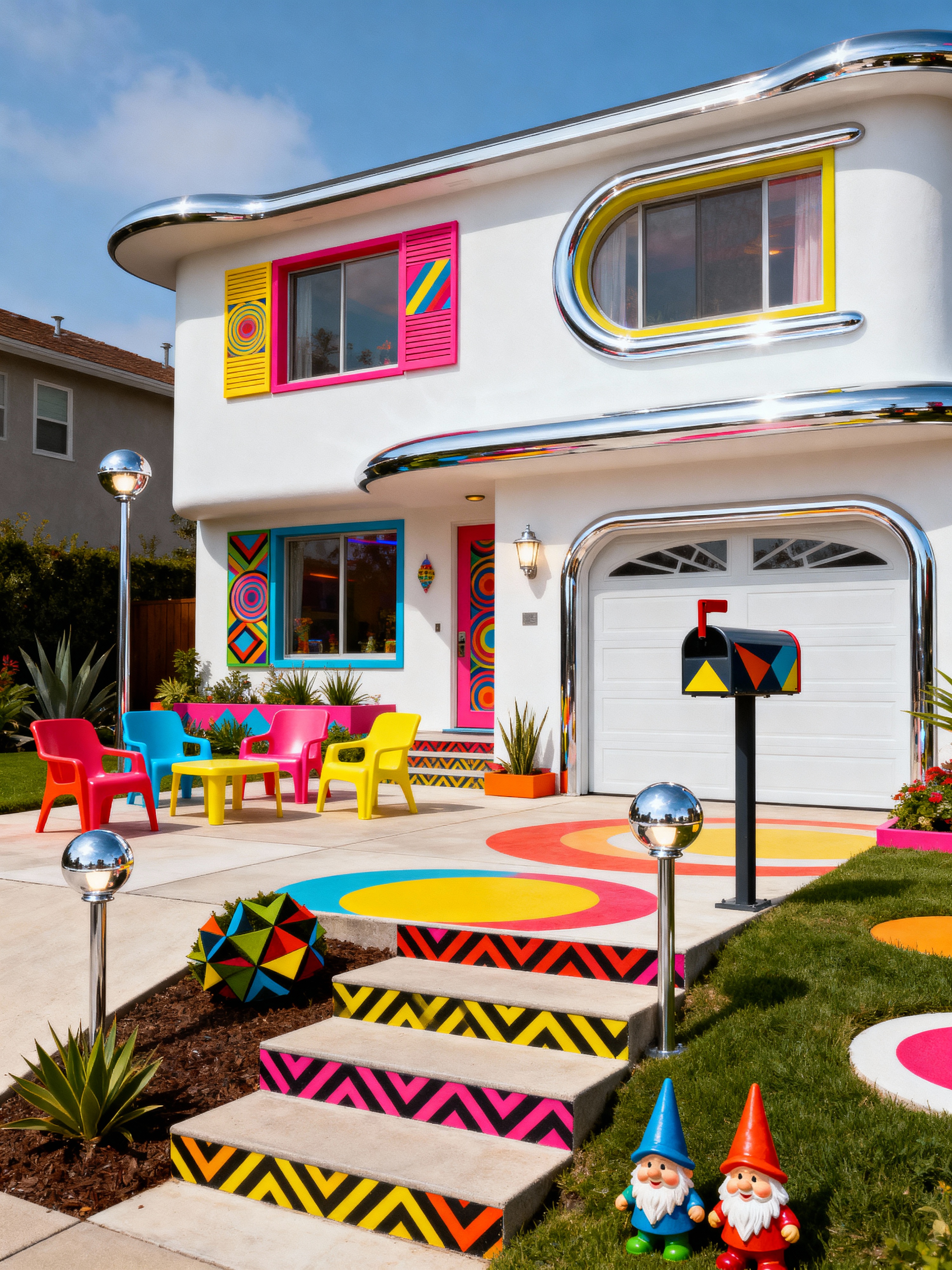 house exterior with retro style with shutters and mailbox and driveway and windows and steps and landscaping and garage door and outdoor lighting. . with plastic furniture and bright colors and bold patterns and geometric shapes and space age and chrome accents and groovy vibes and funky decor