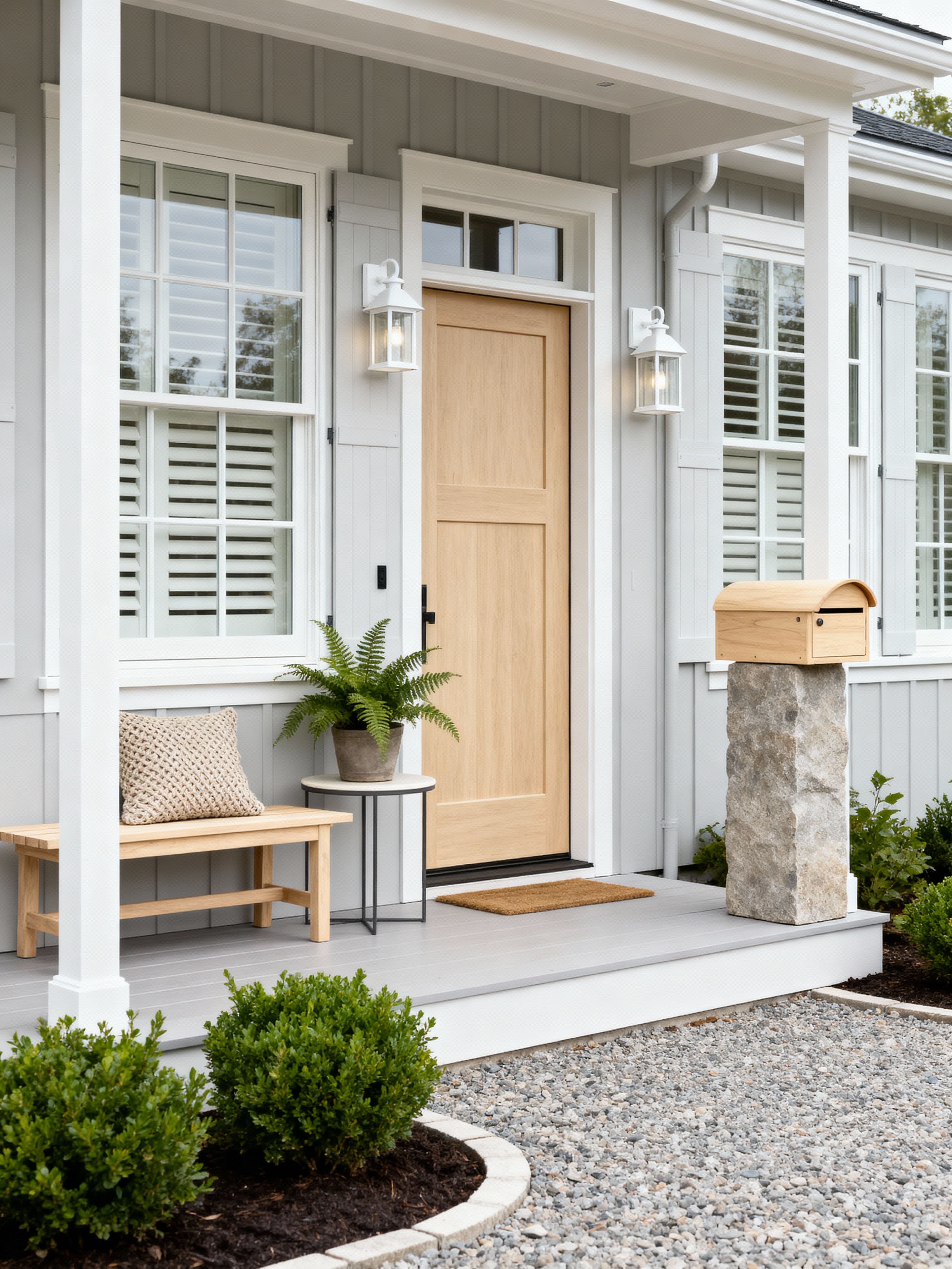 house exterior with scandinavian style with mailbox and porch and landscaping and front door and outdoor lighting and shutters and windows and driveway. . with light wood and hygge and natural light and minimalist design and functional furniture and textured fabrics and simple elegance and neutral palette