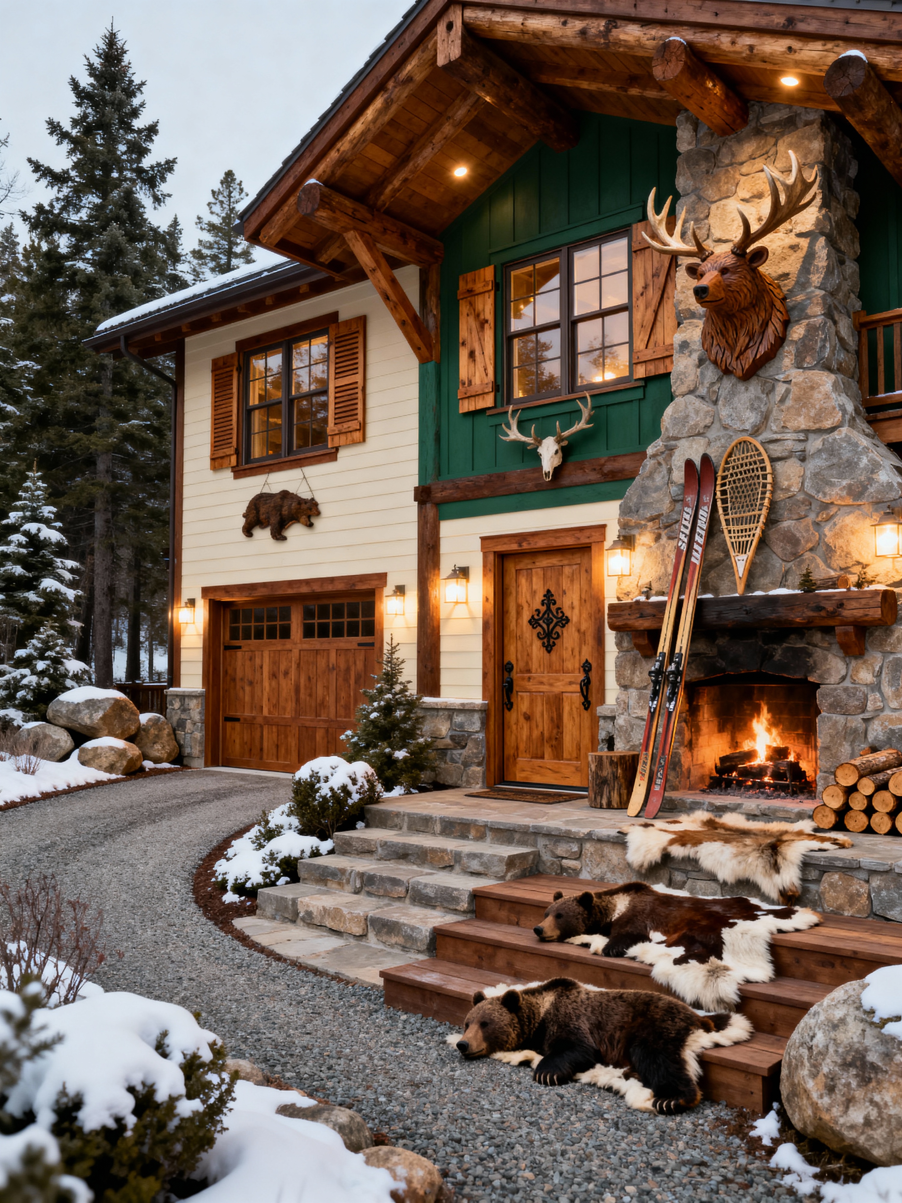 house exterior with ski chalet style with outdoor lighting and driveway and windows and steps and garage door and landscaping and shutters and front door. . with animal motifs and stone fireplace and ski-themed decor and animal rugs and stone fireplace and wood beams and wooden logs and rustic