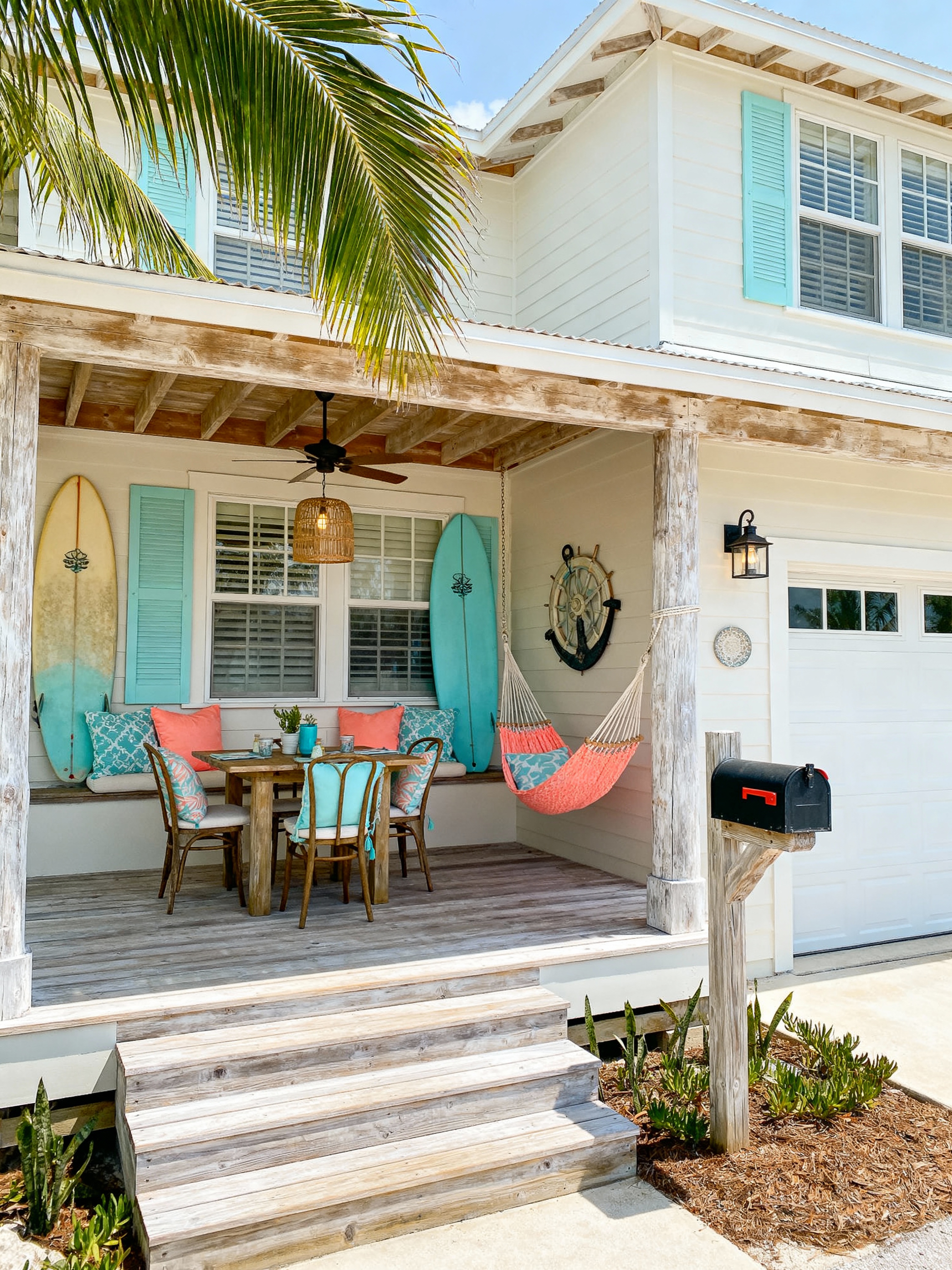 house exterior with surf shack style with mailbox and windows and porch and garage door and driveway and steps and outdoor lighting and shutters. . with casual dining and sun-bleached wood and beachy throw pillows and hammocks and turquoise accents and coral accents and surfboard decor and palm fronds