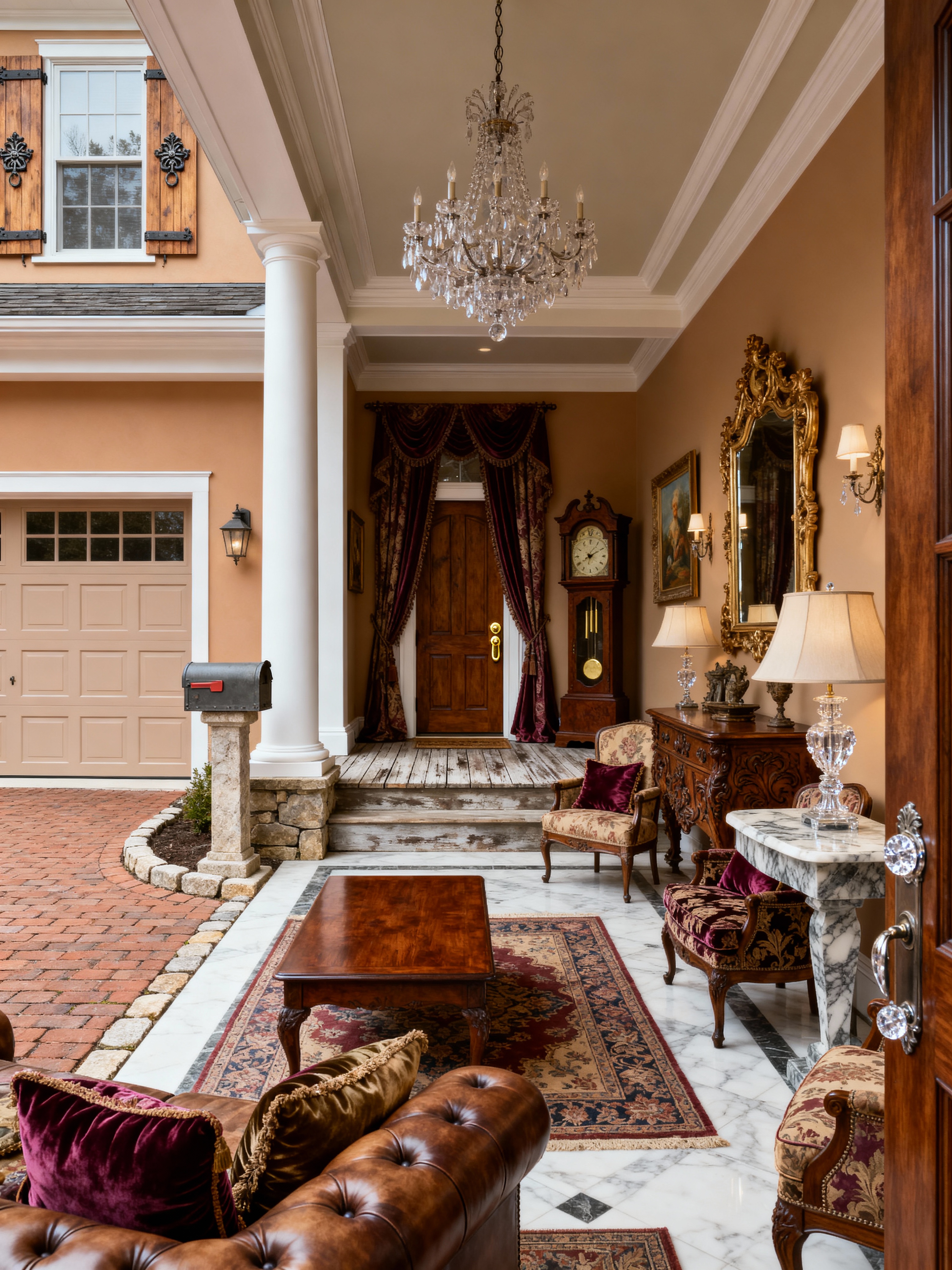 house exterior with traditional style with landscaping and driveway and shutters and mailbox and porch and garage door and steps and windows. . with formal furniture and crown molding and refined atmosphere and luxurious textiles and antique pieces and classic elegance and rich fabrics and timeless design