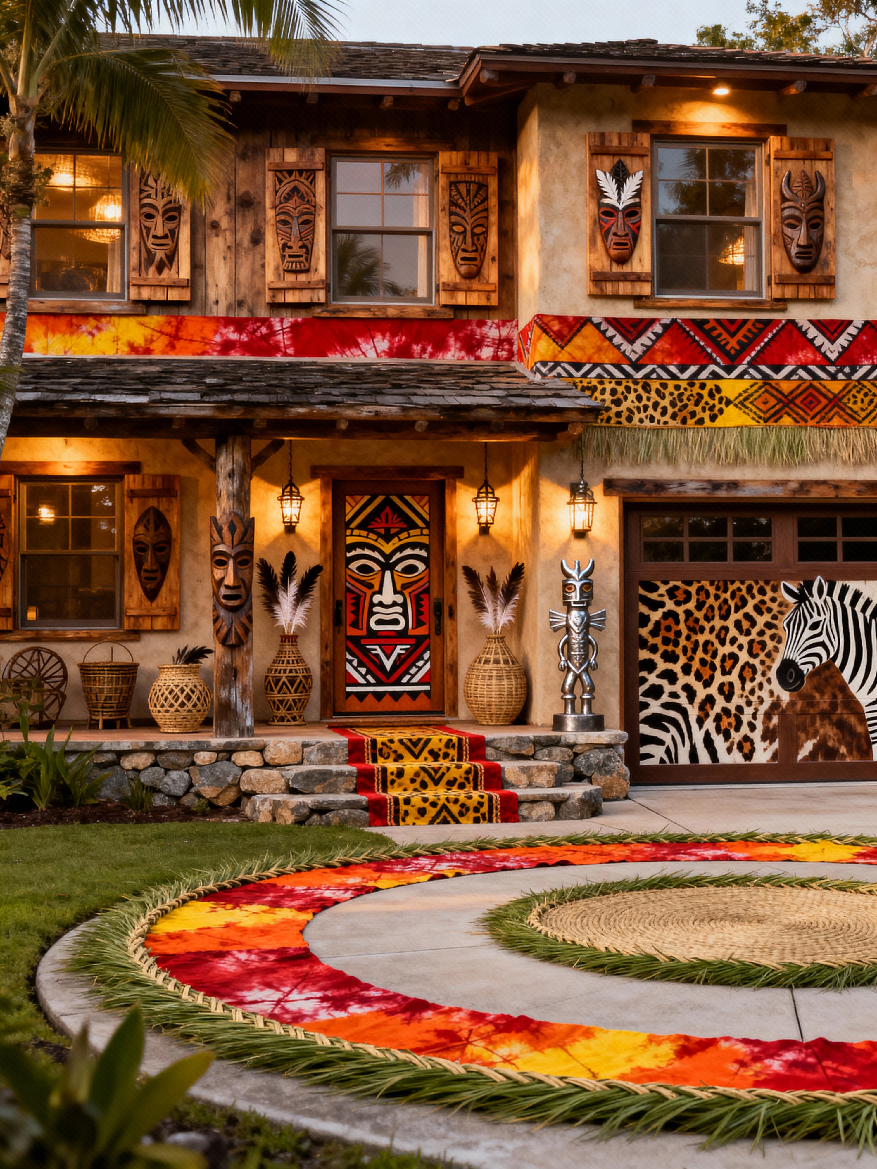 house exterior with tribal style with windows and outdoor lighting and front door and garage door and steps and driveway and porch and shutters. . with sculptures and artworks and tribal revival and exuberant splashes of colour and hand dyed batik fabrics and intricate grass weaving and tribal patterns and animal prints and smooth worn timbers