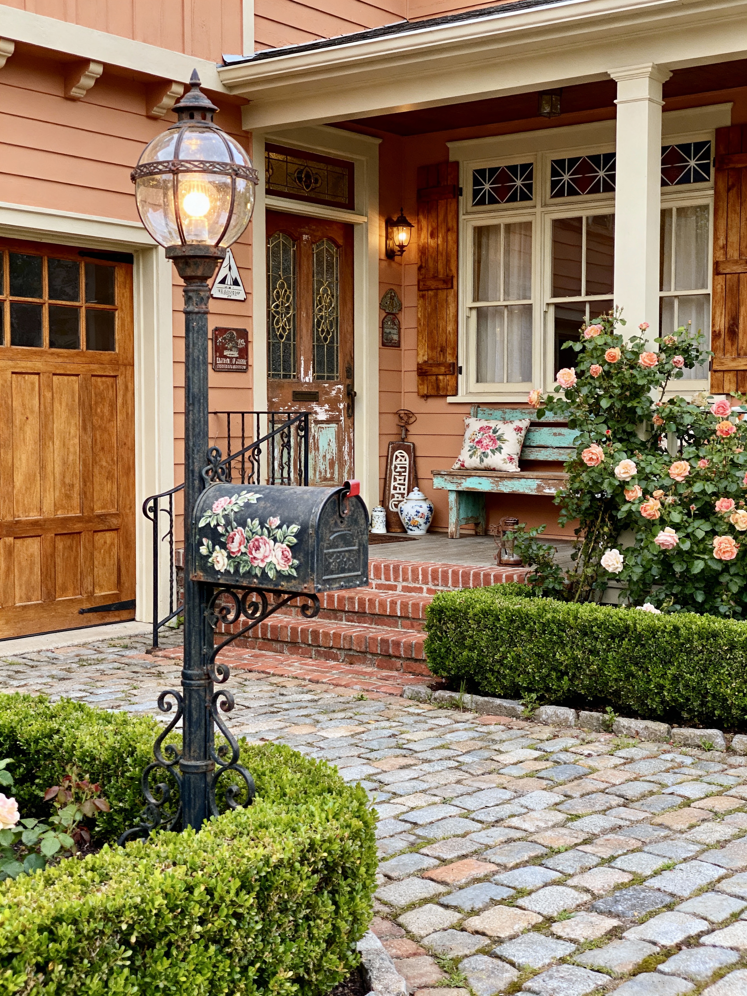 house exterior with vintage style with outdoor lighting and driveway and garage door and front door and steps and landscaping and mailbox and windows. . with retro style and mid-century and timeless pieces and shabby chic and ornate details and antique decor and nostalgic feel and upcycled furniture